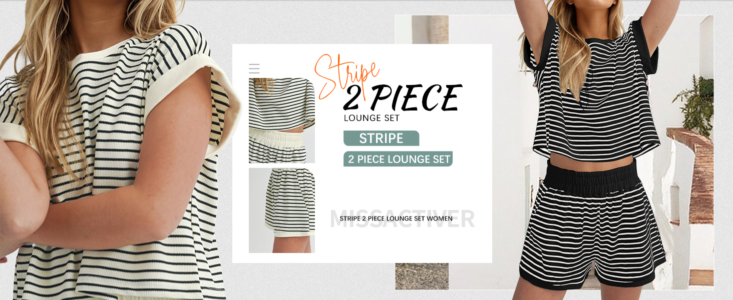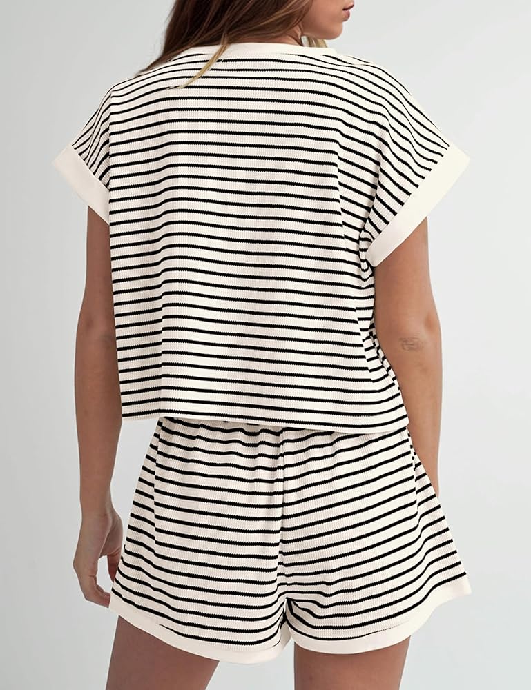 المزايا: طقم شورت مكون من قطعتين للنساء، أطقم صالة، طقم بيجامات متطابق، بلوفر علوي مخطط بأكمام قصيرة، شورت خصر مرن مع جيوب، طقم شورت تي شيرت مضلع كاجوال، ملابس ربيع وصيف مكونة من قطعتين.