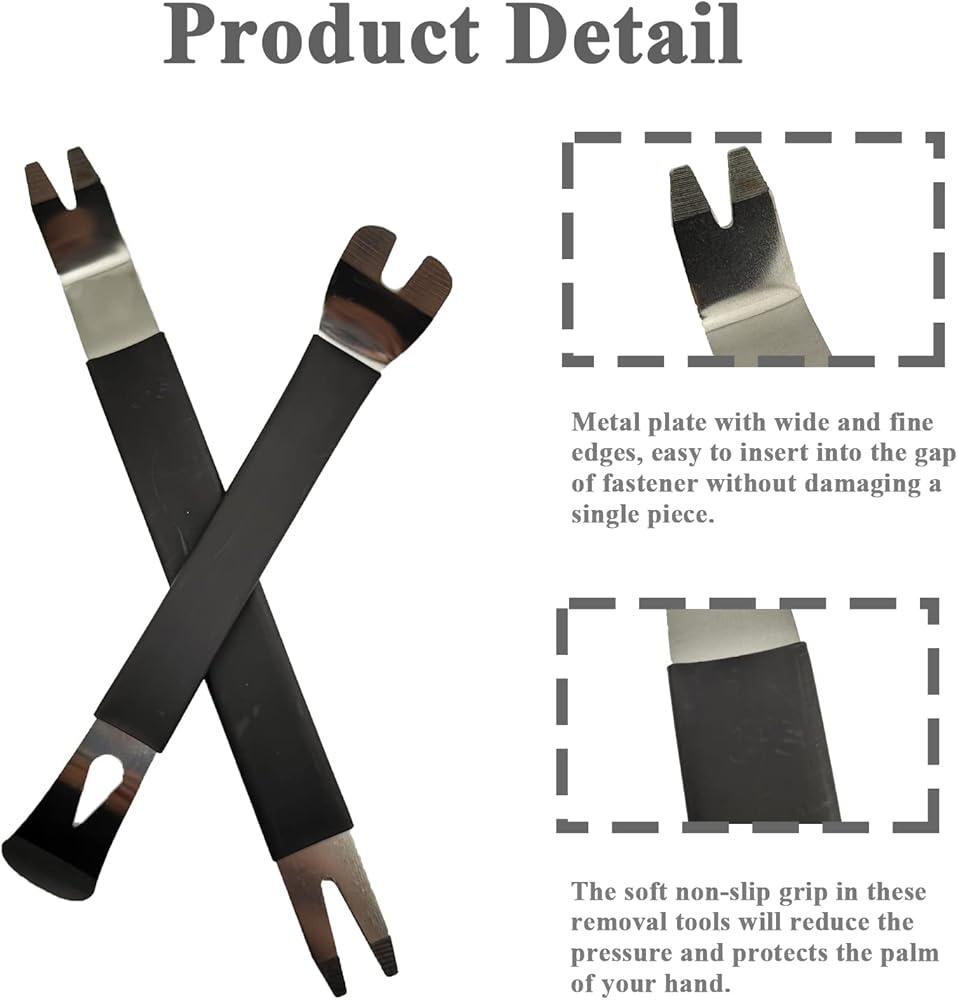 The soft non-slip grip in these removal tools will reduce the pressure and protects the palm of your hand.Metal plate with wide and fine edges, easy to insert into the gap of fastener without damaging a single piece.