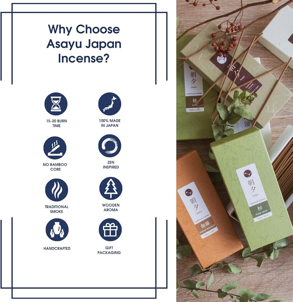 【نبذة عن Asayu Japan 】لدينا جميعًا حياة مزدحمة. لكن في بعض الأحيان يكون من الجيد أن تأخذ نفسًا عميقًا وتتواصل مع ذاتك الداخلية. ابدأ يومك بعقلية صافية وانتهي ليلاً بالتفكير بهدوء فيما أنجزته. هذا هو ما يمكن لأعواد البخور اليابانية أن تساعدك على القيام به. يستريح. يتصل. يتأمل. أو بكل بساطة، اعتني بنفسك فقط.