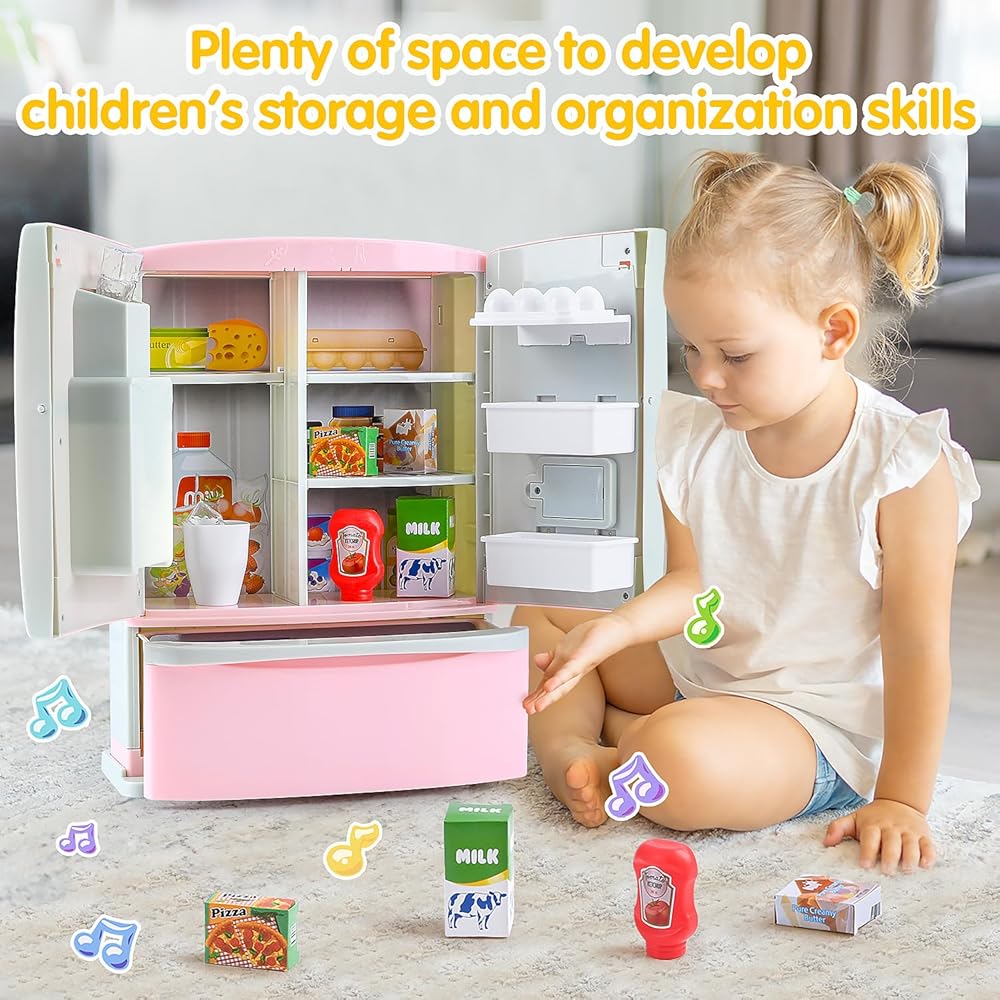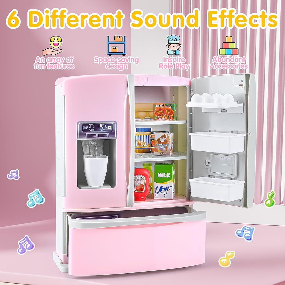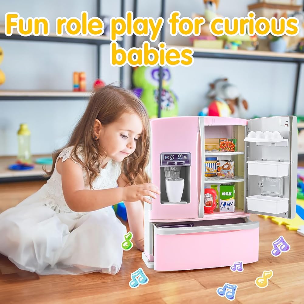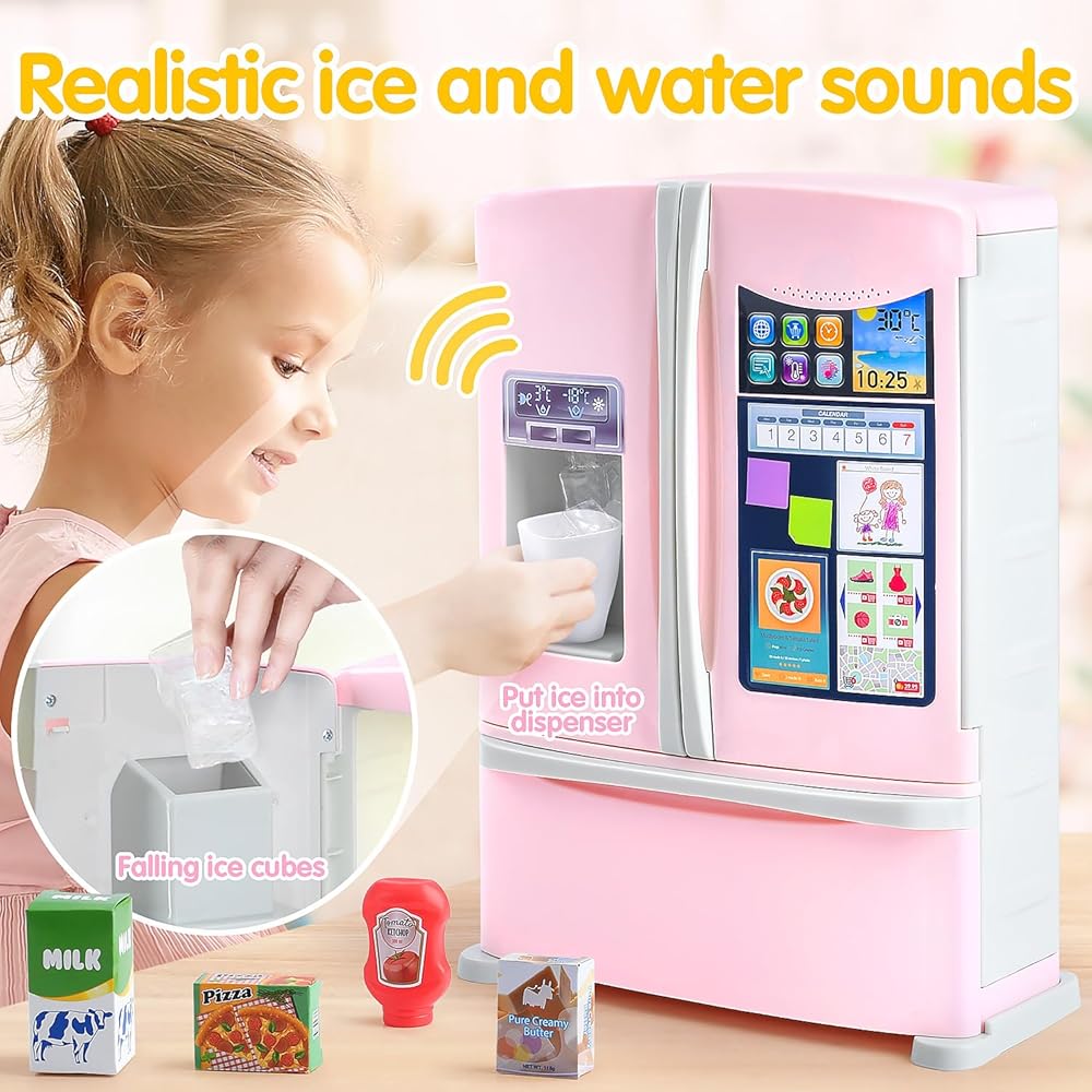 بلاي كيدز مطبخ ثلاجة مع موزع ثلج، مجموعة مطبخ ثلاجة للعب التظاهري للأطفال الصغار، لعبة ملحقات أجهزة المطبخ للفتيات الصبي عيد الميلاد هدية عيد ميلاد سن 1-3 4-8، وردي