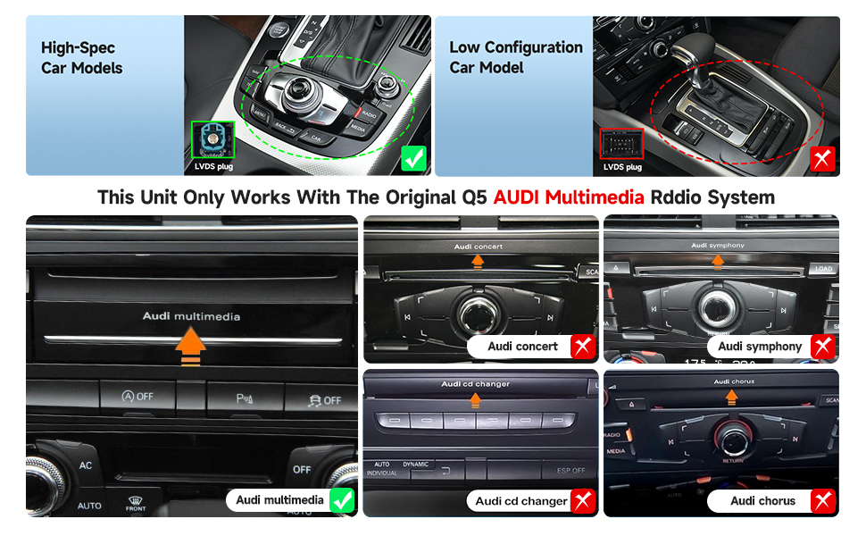 • مصمم حصريًا لسيارة Audi Q5 2009-2016 مع نظام راديو Audi Multimedia الأصلي. قبل الشراء، يرجى تحديد أن سيارتك هي نظام مضخم الأقراص المضغوطة "Audi Multimedia". إذا كنت حفلة موسيقية أصلية من Audi أو Audi Symphony، فإن هذه الوحدة لا تناسبك، فيُرجى البحث وشراء الرقم التعريفي القياسي ASIN: B0CBBM4KNN على أمازون.