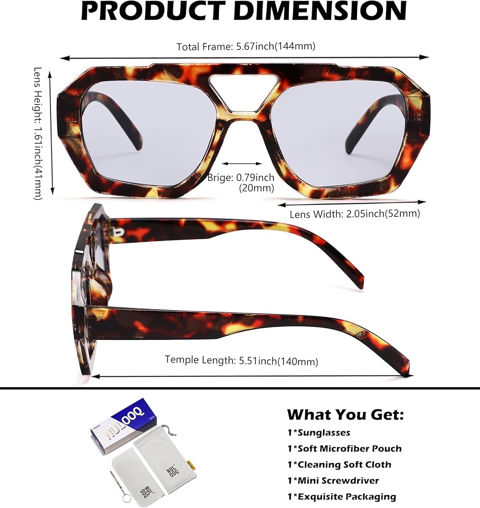 أبعاد المنتج - عرض العدسة: 52 ملم (2.05 بوصة) | ارتفاع العدسة: 41 ملم (1.61 بوصة) | طول الصدغ: 140 ملم (5.51 بوصة) | إجمالي عرض الإطار: 144 ملم (5.67 بوصة) | جسر الأنف: 20 ملم (0.79 بوصة). العبوة - نظارات شمسية*3، حقيبة ناعمة من الألياف الدقيقة*3، قطعة قماش ناعمة للتنظيف*3، مفك براغي صغير*1، صندوق نظارات*1.