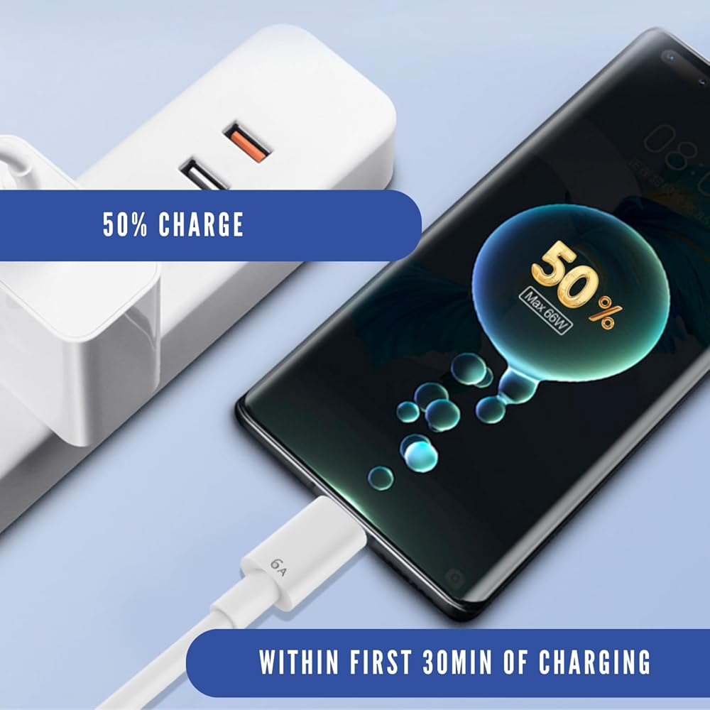 Super Fast Charging: Compatible withsuper fast charging technology, this cable enables quick charging for devices like the Samsung S23 Ultra, reaching up to 89% battery capacity in just 30 minutes, surpassing the 54% achieved by a standard 3A cable.