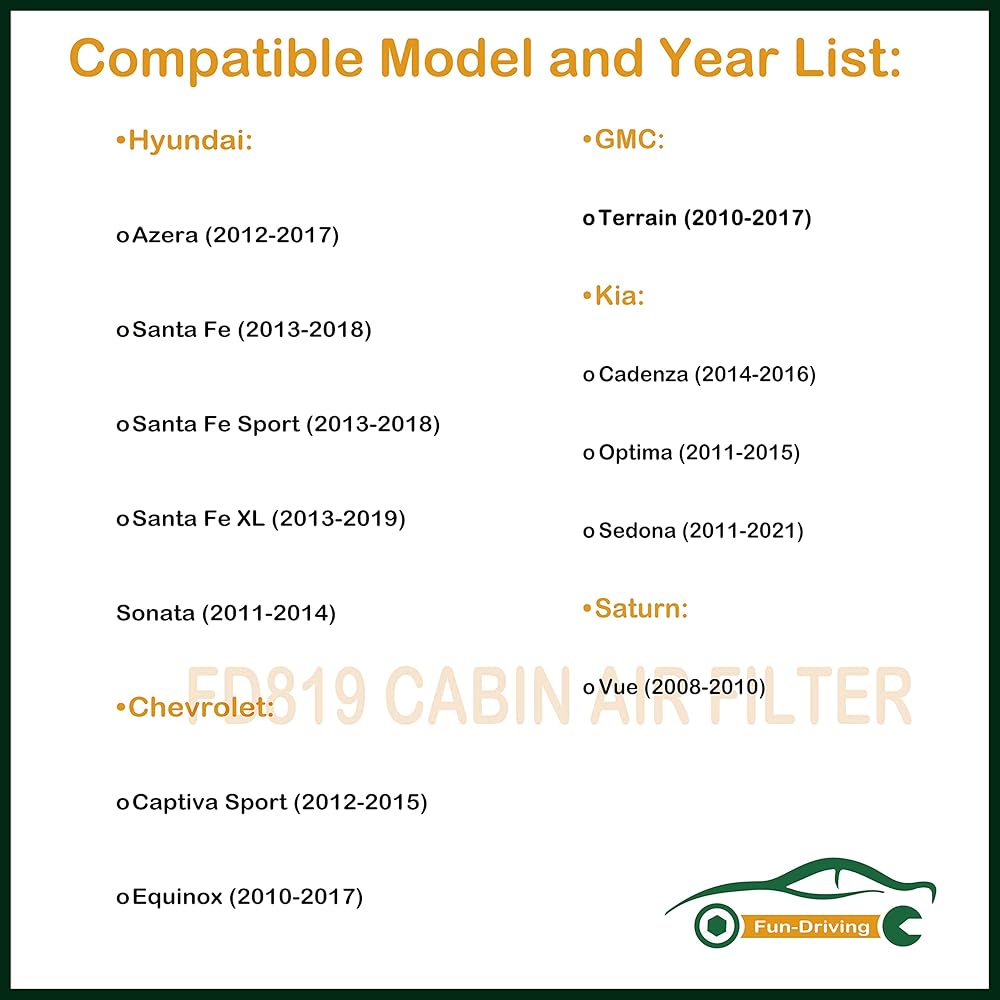 FUN-DRIVING FD819 استبدال فلتر هواء المقصورة لـ CF11819، CP819