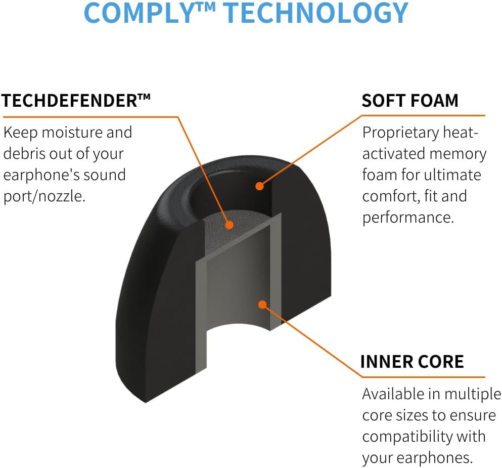 EARBUDS STAY IN PLACE: Never let your earbuds fall out again. Comply memory foam ear tips are engineered to conform to your ear, providing a better grip than silicone. Whether you're exercising, working, or going about your day, our replacement tips will keep your earbuds from falling out. TECHDEFENDER SOUND NOZZLE PROTECTION: These ear tips include TechDefender, an acoustically transparent foam that protects your earbuds and in ear monitors from wax, sweat, debris and moisture.