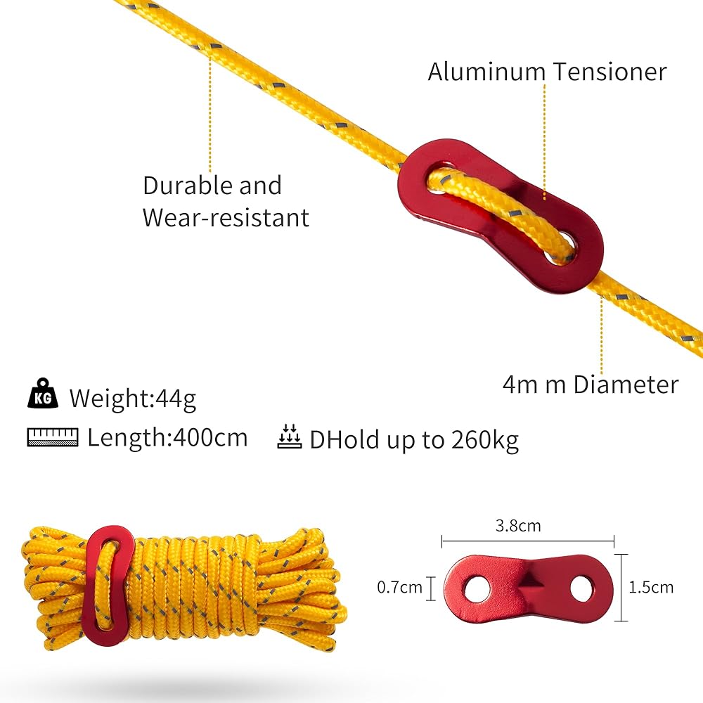 • 【حبال خفيفة الوزن ومحمولة】يبلغ طول كل خط رجل مع شد حوالي 13 قدمًا وقطره 5 مم ويزن 0.77 رطل فقط، وخفيفة كافية لحقيبة الظهر، ومجموعات الملحقات للخيم والأرجوحة وذباب المطر والتخييم والتنزه سيرًا على الأقدام وركوب الدراجات وصيد الأسماك والسفر وما إلى ذلك. النشاط وتأمين أي شيء بشكل جيد ...