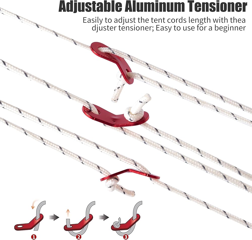 • 【شداد ألومنيوم】يأتي مع 6 قطع من شدادات الألومنيوم، مما يسمح بتعديلات سهلة وقوية، ويستخدم على نطاق واسع لتوصيل حبل الخيمة وتعديل الطول.