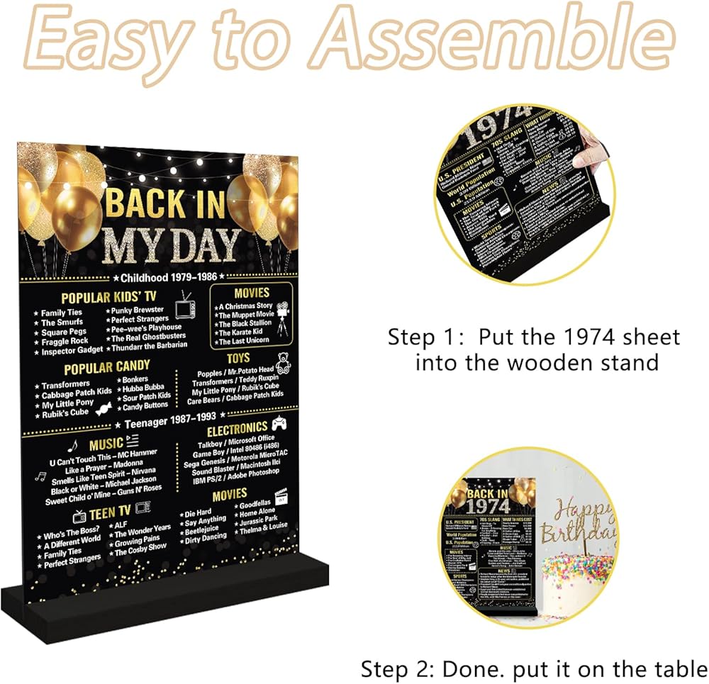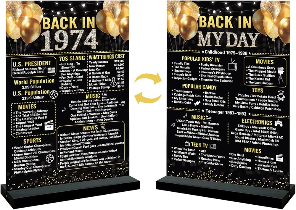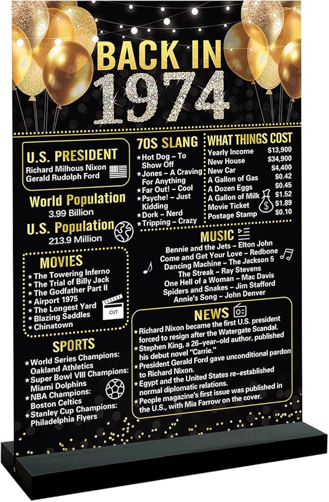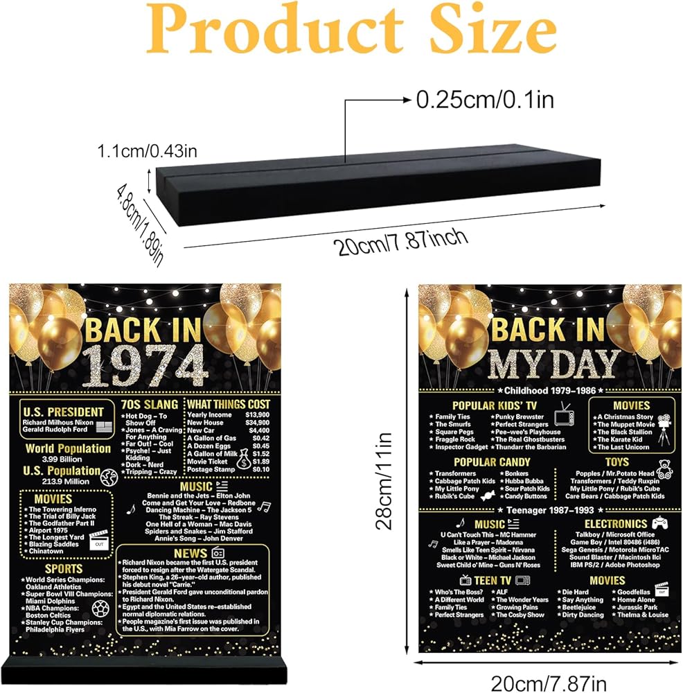 ⭐【عيد الميلاد الخمسين】تتضمن العبوة علامة أكريليك أنيقة عتيقة مقاس 7.9 × 11 بوصة من عام 1974 وحوامل خشبية سوداء. تطبع لافتة ديكور عيد الميلاد الخمسين ما حدث في عام 1974 لإضافة المرح إلى حفلتك وتتيح لك العودة إلى يوم 1974 والهتاف لمدة 50 عامًا.