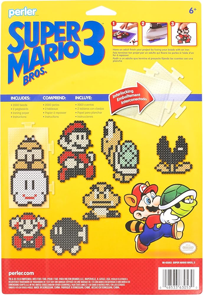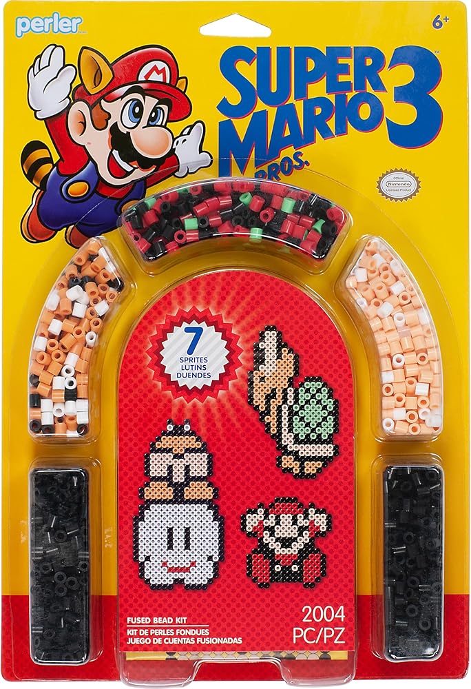 Go old school with the Perler Beads Super Mario 3 Pattern Craft Kit! Use the included fusion beads, tweezers, and ironing paper to create an iconic Super Mario craft with a vintage, pixelated look! Perler bead kit includes (3500) Perler fuse beads, (1) piece of ironing paper, (1) tweezer, and (1) set of instructions. Requires 4 interlocking Perler bead pegboards, not included. For ages 6 and up.