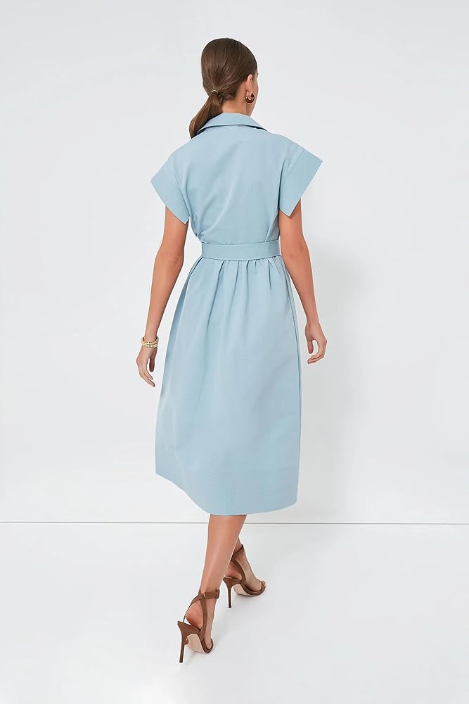 السمات: ياقة واسعة، وأكمام قصيرة مجنحة، وحزام قماش اختياري قابل للتعديل مع إبزيم للإغلاق، وفتحة أزرار أمامية، وخياطة ترابونتو على الأكمام، والفتحة، والحاشية، وطول متوسط. أنيق في بساطته، ومنظم وأنيق للغاية.