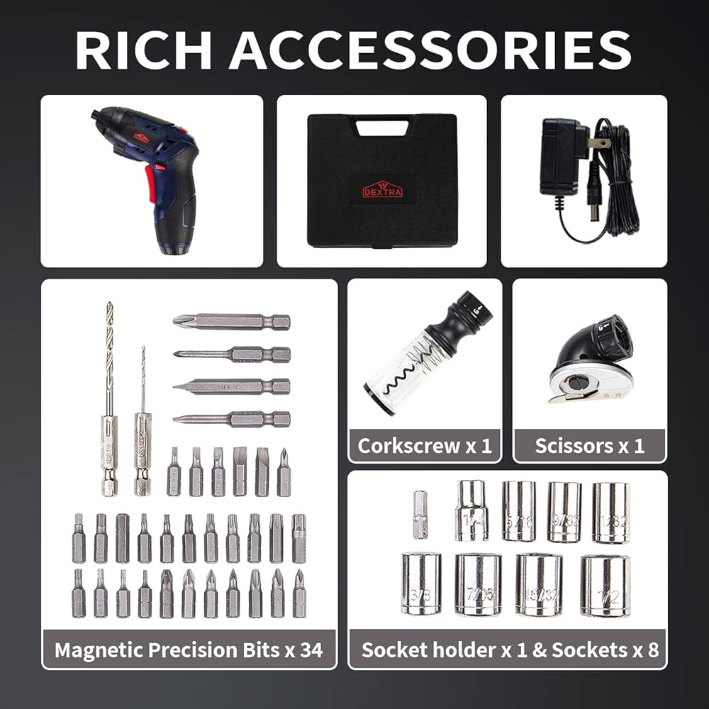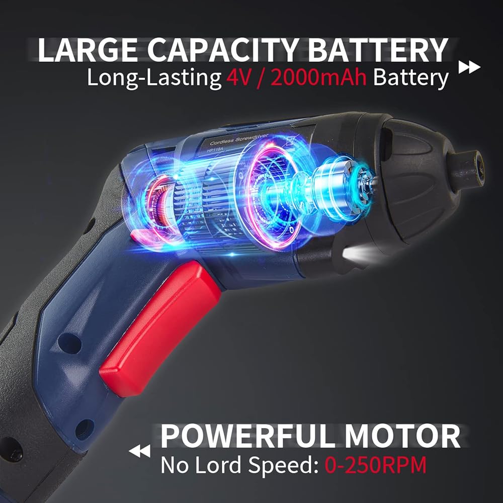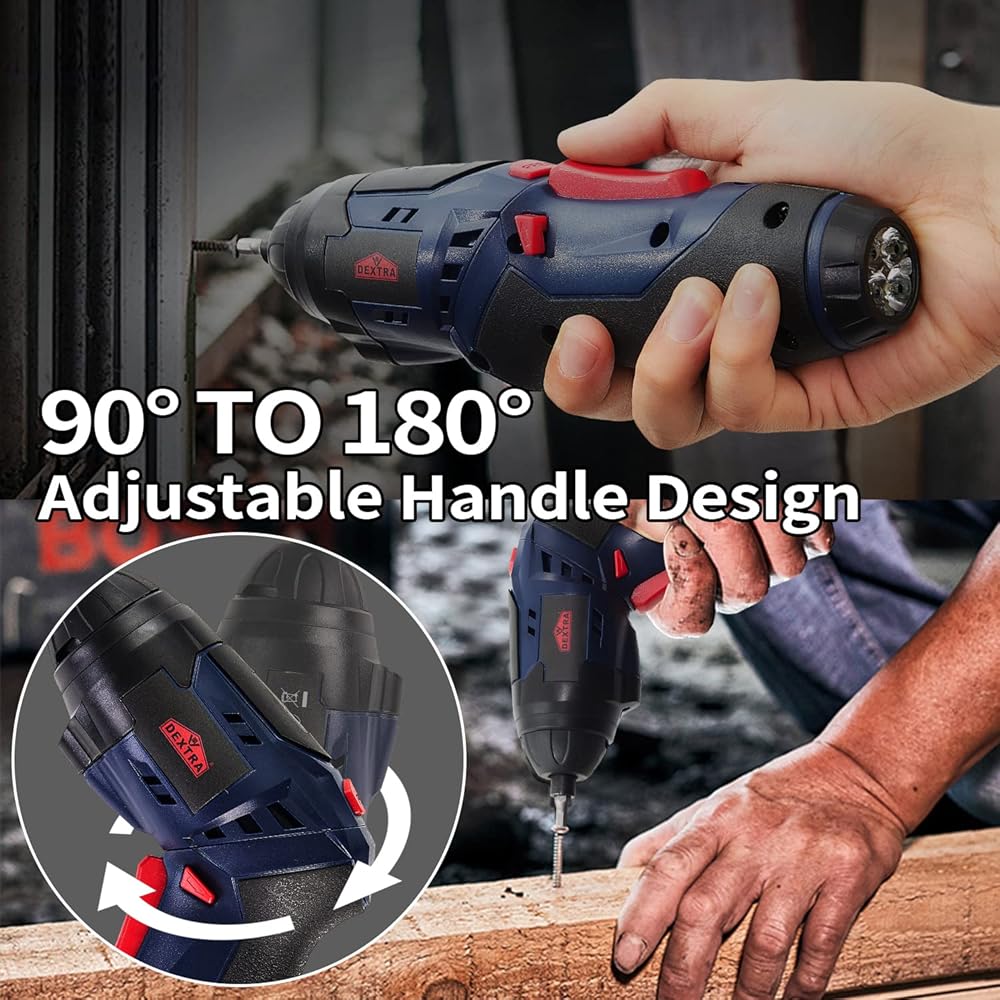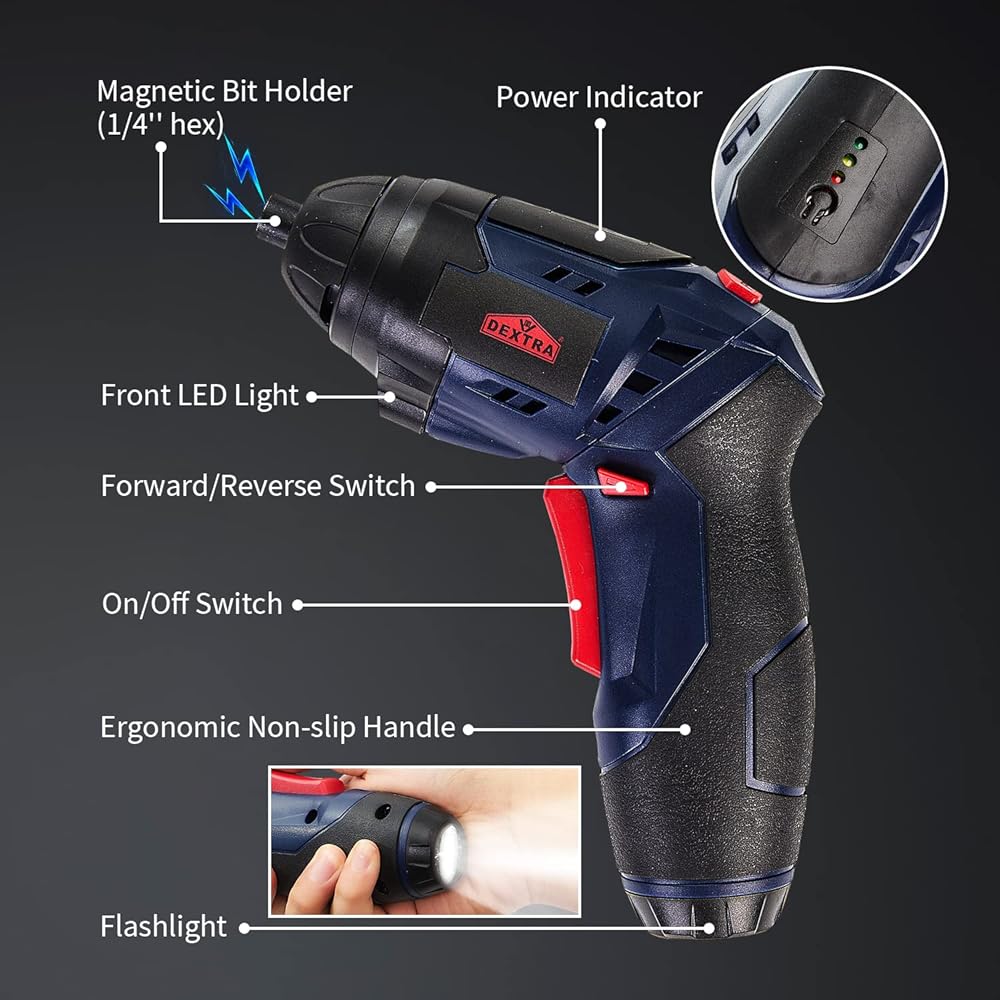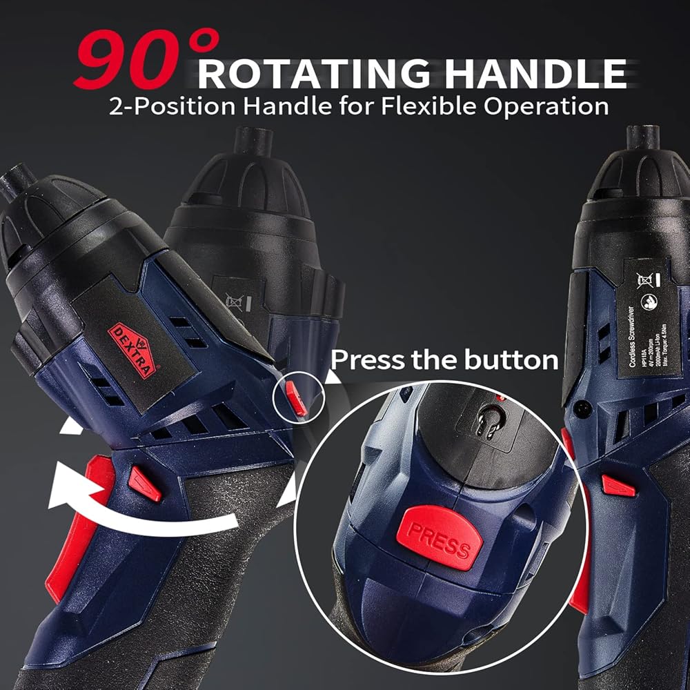 🪛𝗕𝗘𝗧𝗧𝗘𝗥 𝗕𝗔𝗧𝗧𝗘𝗥𝗬 & 𝗧𝗬𝗣𝗘-𝗖 𝗖𝗛𝗔𝗥𝗚𝗜𝗡𝗚: مفك الطاقة الكهربائية Dextra أمر لا بد منه لأي صندوق الأدوات. مع بطارية ليثيوم قابلة لإعادة الشحن بقدرة 2000 مللي أمبير في الساعة وكابل USB من النوع C، يمكنك التأكد من حصولك على الطاقة دائمًا - ولا داعي للقلق بشأن فقدان سلك خاص. ستسمح لك عملية الشحن الكاملة مرة واحدة بالعمل حتى 250 مرة، مما يمنحك قوة يمكن الاعتماد عليها لإنجاز المهمة!
