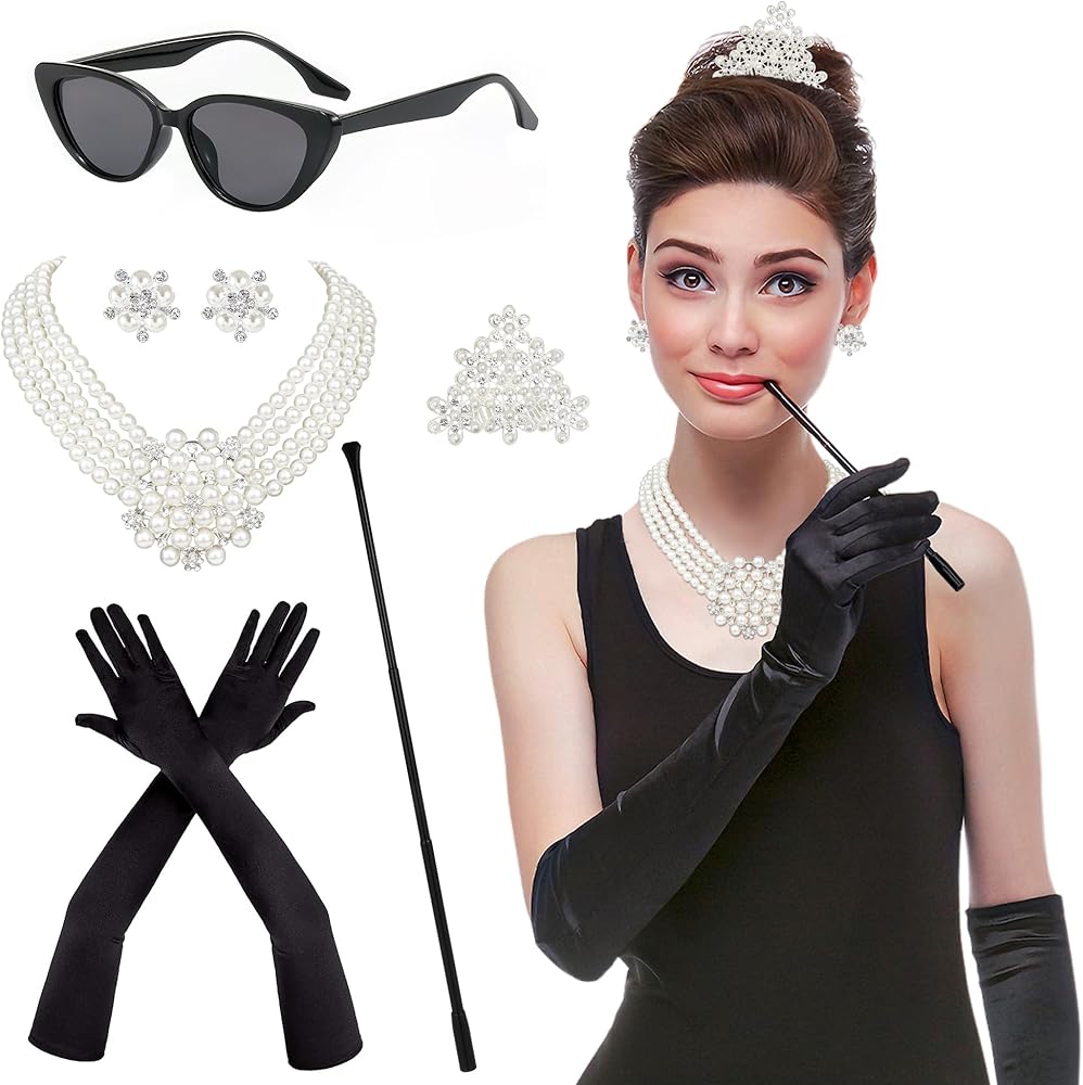 ✨ إكسسوارات العشرينيات - 1 قلادة على شكل زهرة مرصعة بالجواهر، 1 زوج من أقراط اللؤلؤ، 1 قطعة شعر تاج كمثرى، 1 زوج من النظارات الشمسية السوداء على شكل عين القطة، 1 زوج من قفازات الساتان السوداء، و1 حامل سجائر قابل للسحب، يمكنك الاختيار من بين مجموعة واسعة من الأنماط للتحول المثالي إلى مظهر كلاسيكي وأنيق.