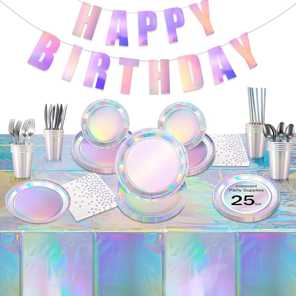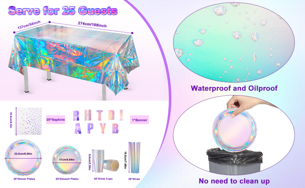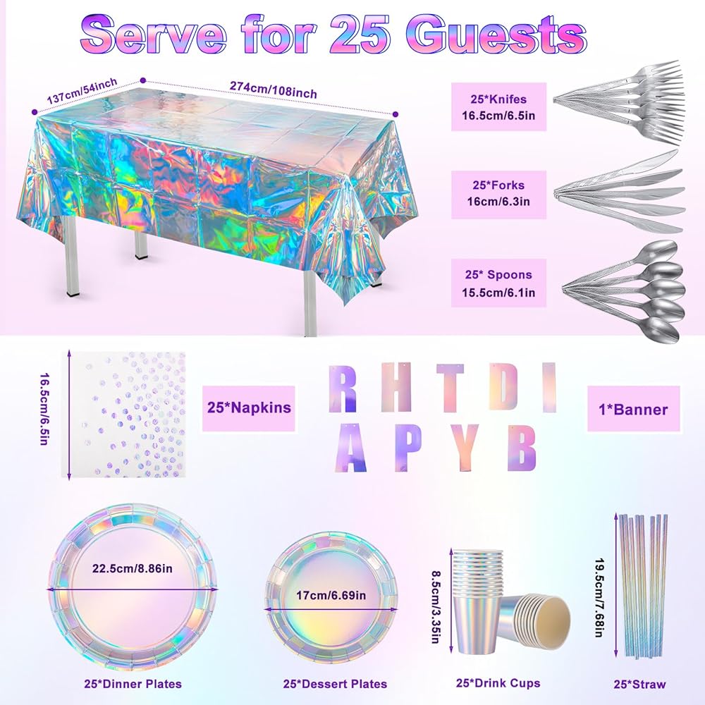 تحتوي العبوة على: سوف تحصل على زخارف الحفلات قزحية الألوان، ويمكن أن تخدم 25 ضيفًا. تتضمن 25 × طبق عشاء ورقي (9 بوصة)، 25 × طبق حلوى ورقي (7 بوصة)، 25 × كوب، 25 × منديل، 25 × ملاعق، 25 × سكاكين، 25 × شوكة، 25 × مصاصة، 2 × مفرش طاولة و25 × سكاكين. 1 × لافتة "عيد ميلاد سعيد".