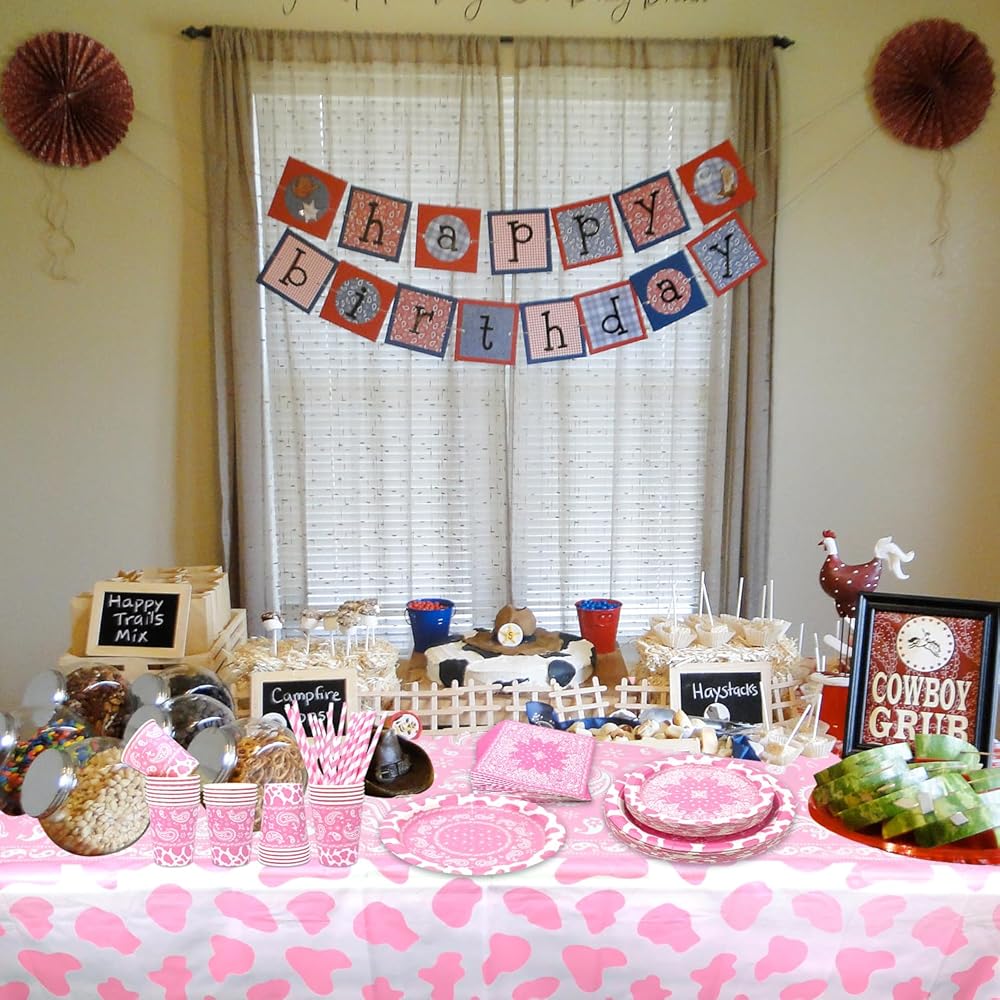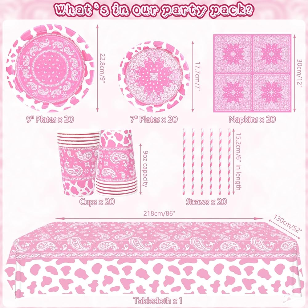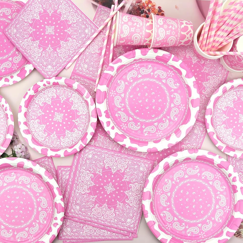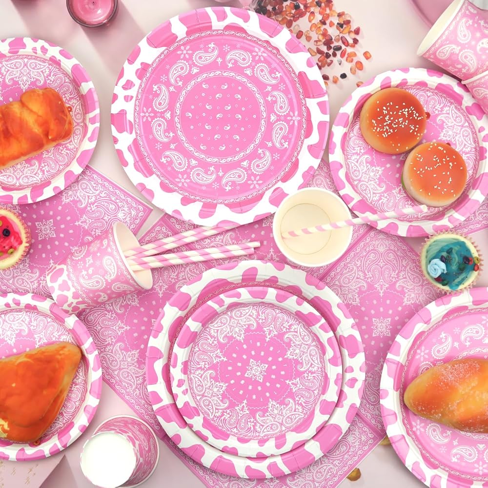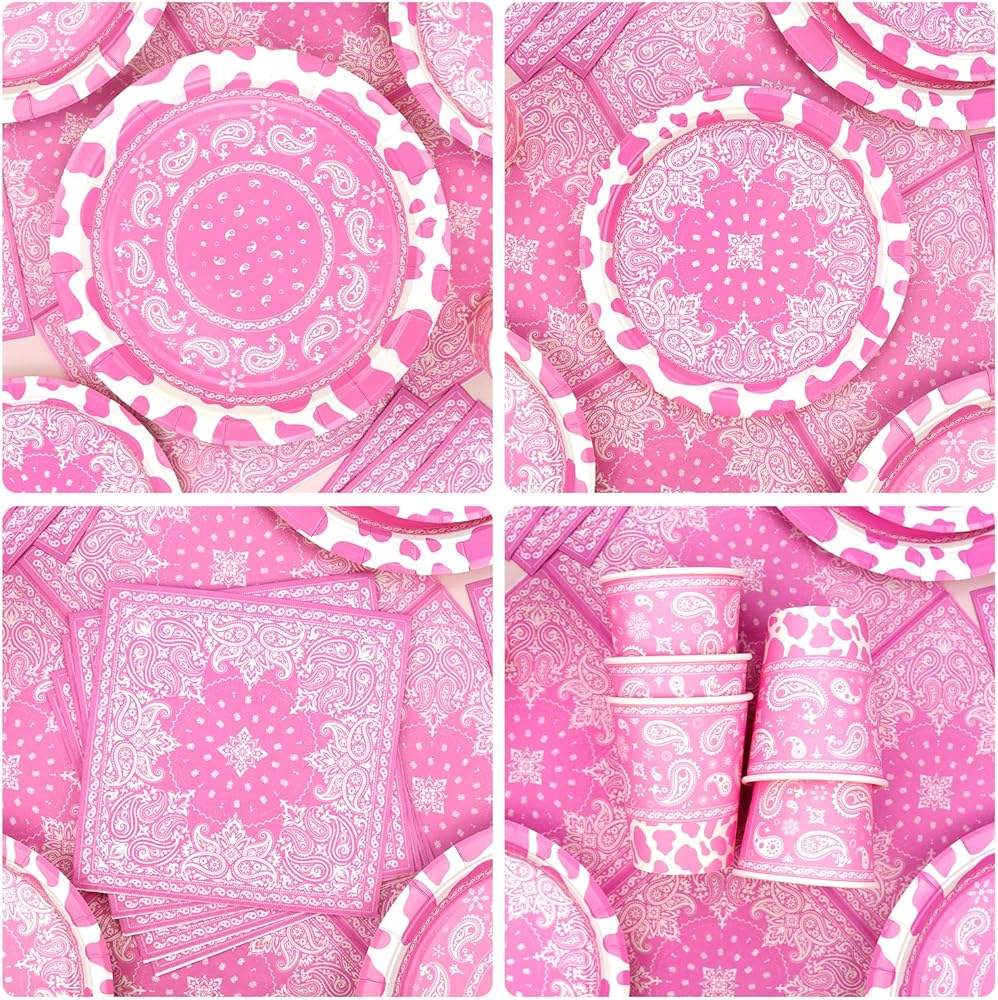 Pink Bandana Western Party Supplies Kit: You will gain 40 9"dinner plates + 40 7" dessert plates + 40 9oz paper cups + 40 napkins + 40 straws + 2 tablecloth.