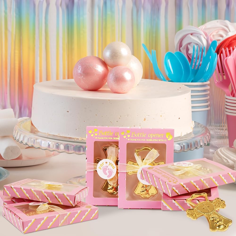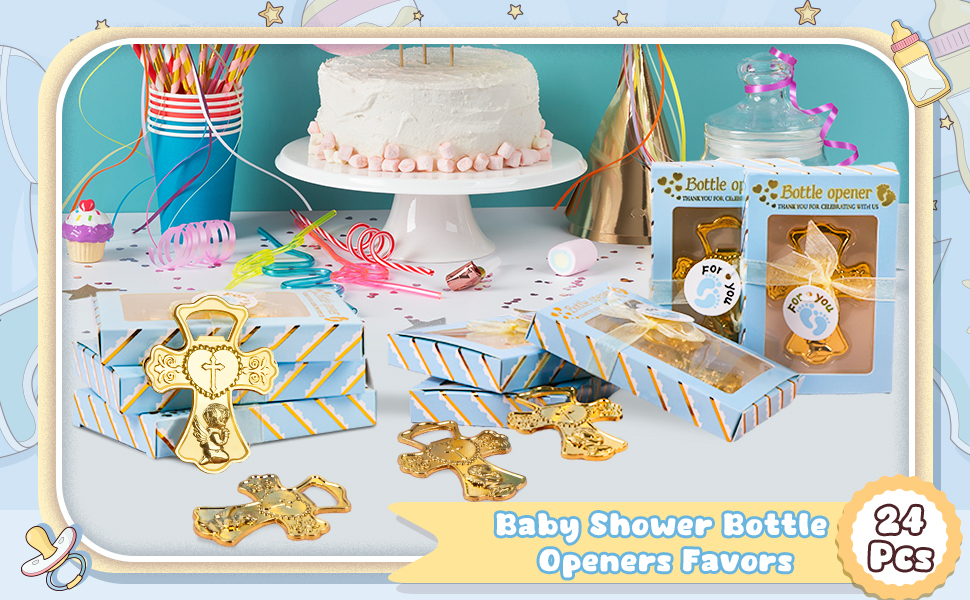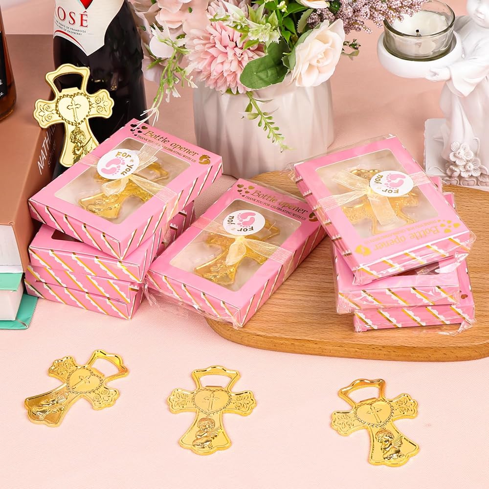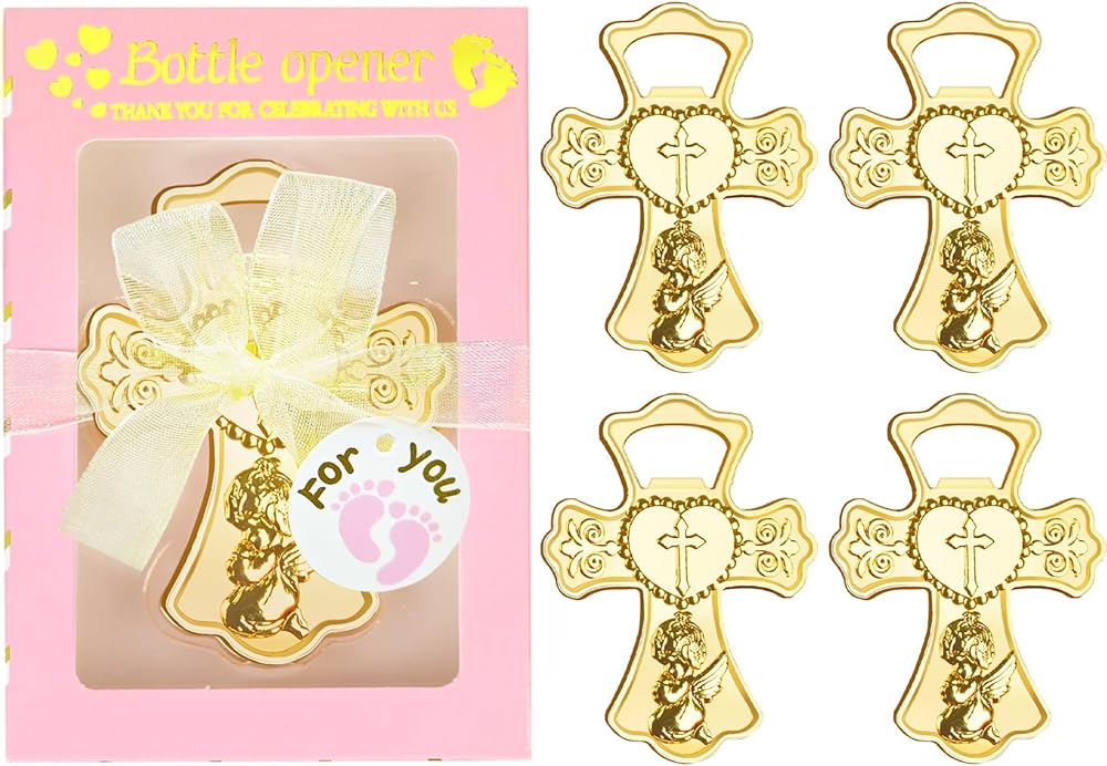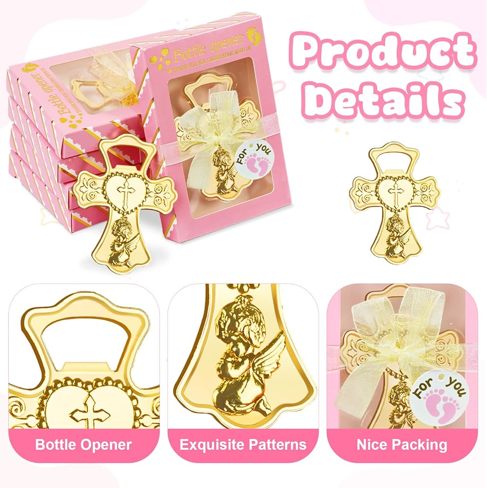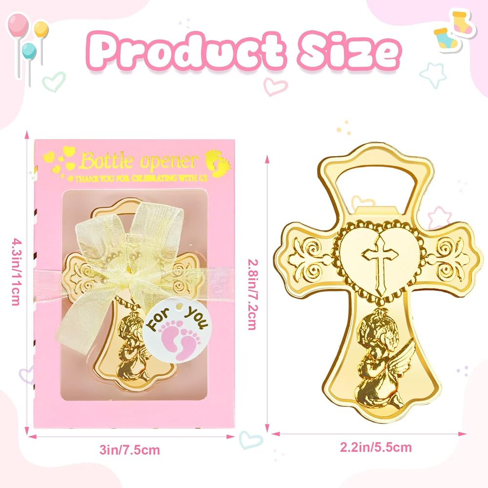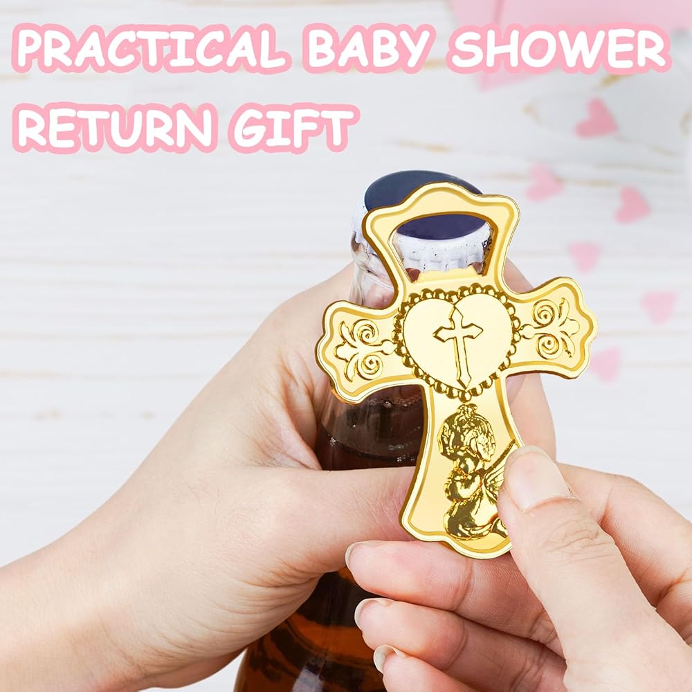 تذكارات الطفل الرضيع العزيزة: تتميز فتاحات زجاجات استحمام الطفل بشكل صليب ذهبي لا يتأثر بمرور الزمن، مما يضفي إحساسًا باللطف والأناقة والسحر، مع الحفاظ على عملية للغاية. إنها تمثل هدايا تذكارية مبهجة لضيوفك في حفل الاستحمام. يمكن للمستلمين استخدام هذه الهدايا بسهولة لفتح الزجاجات أو البيرة.