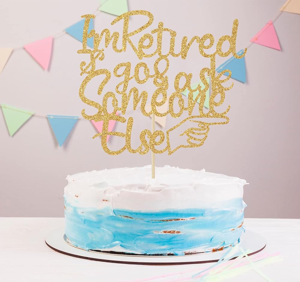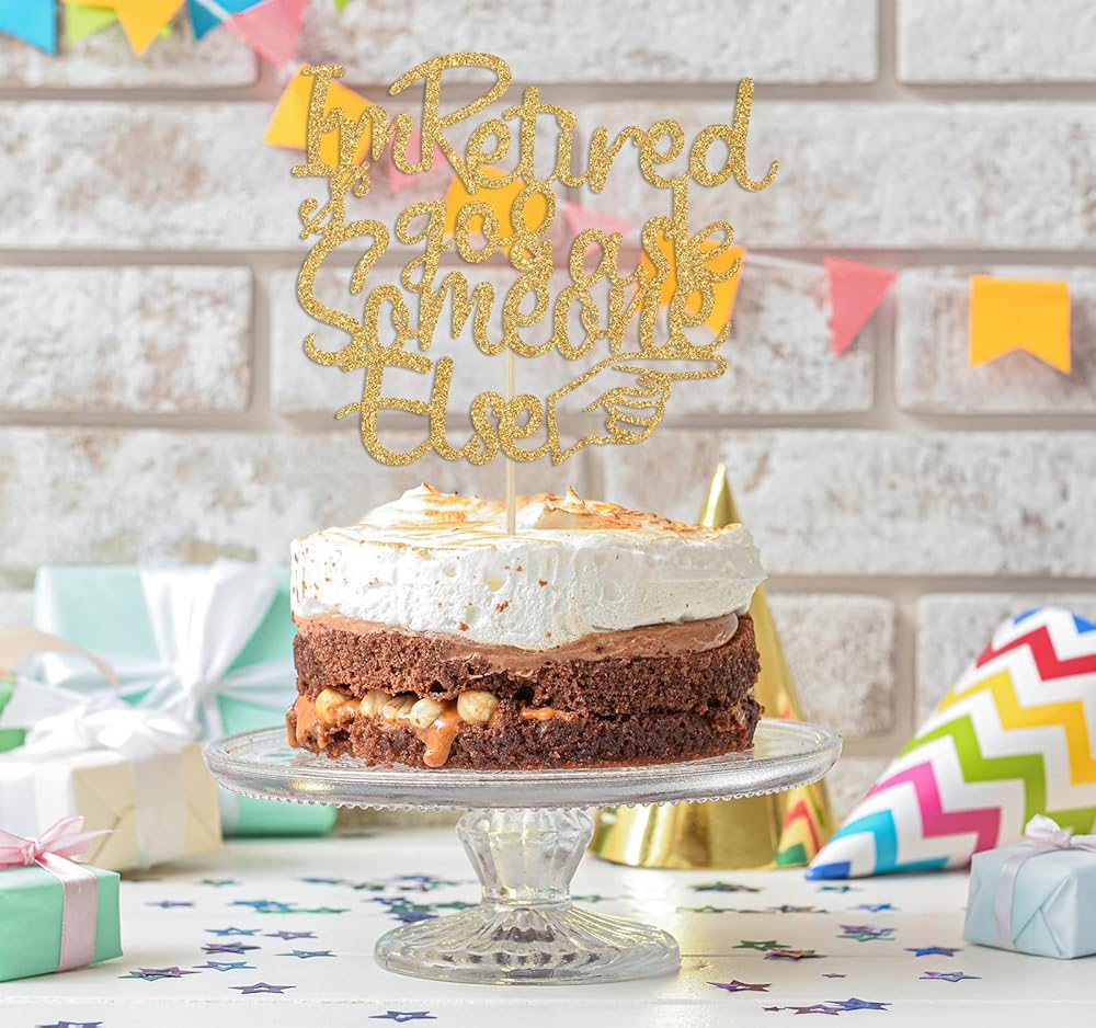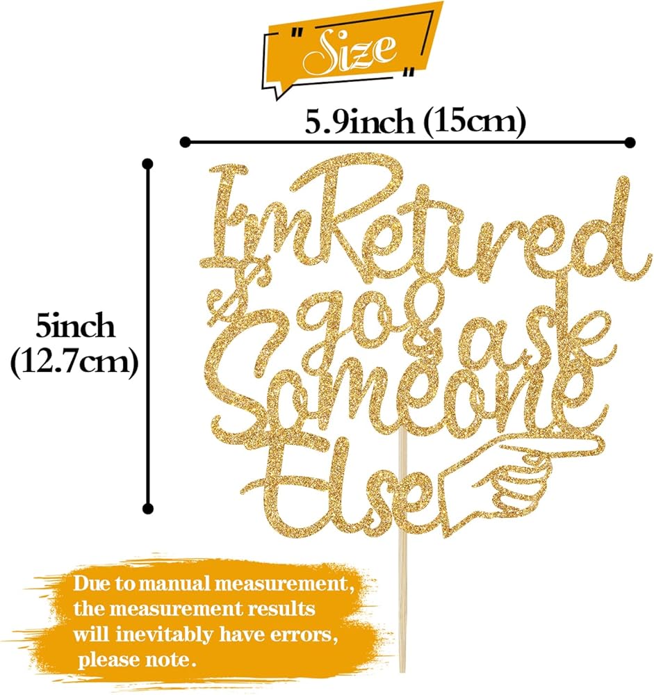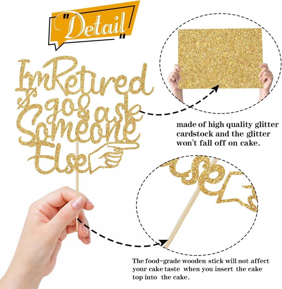 🍲Package Includes: 1 piece of gold glitter "I'm Retired go & ask Someone Else" cake topper comes with a hard cardboard packaging for maximum protection.