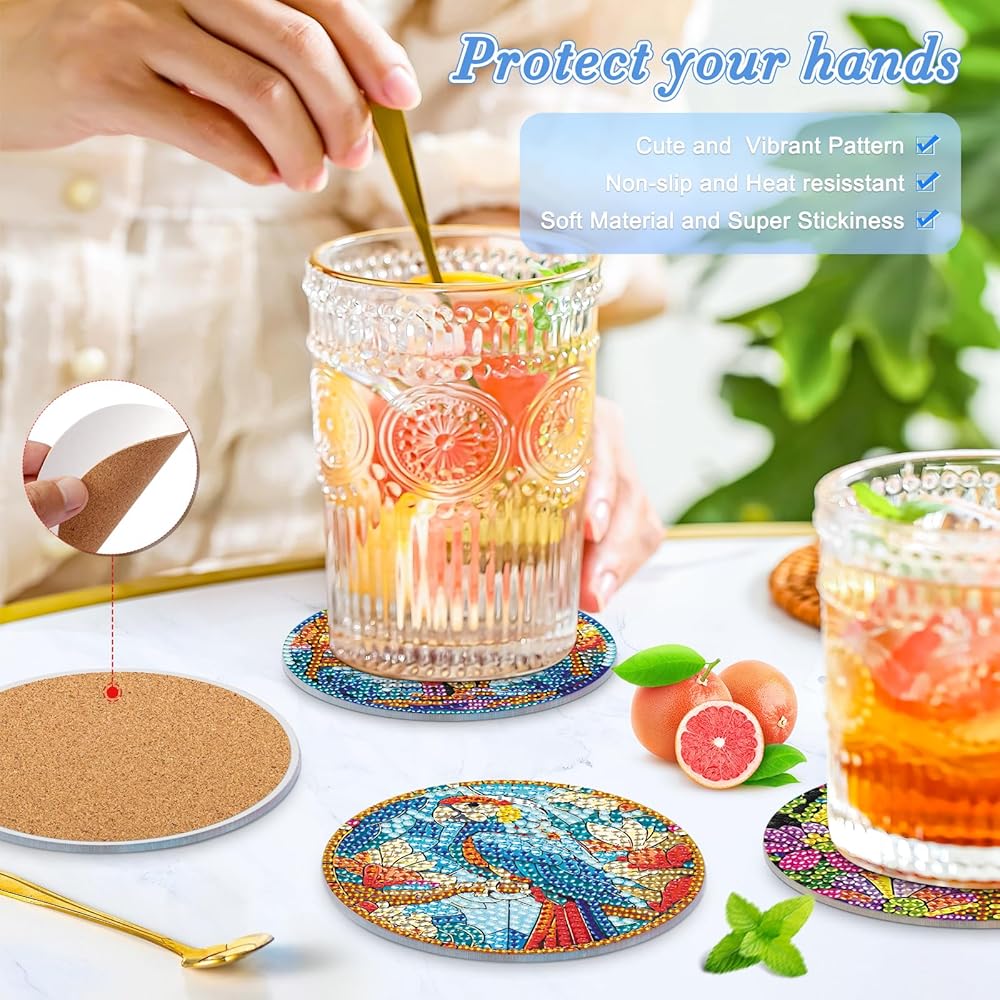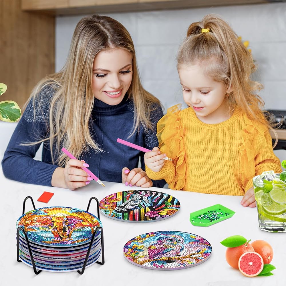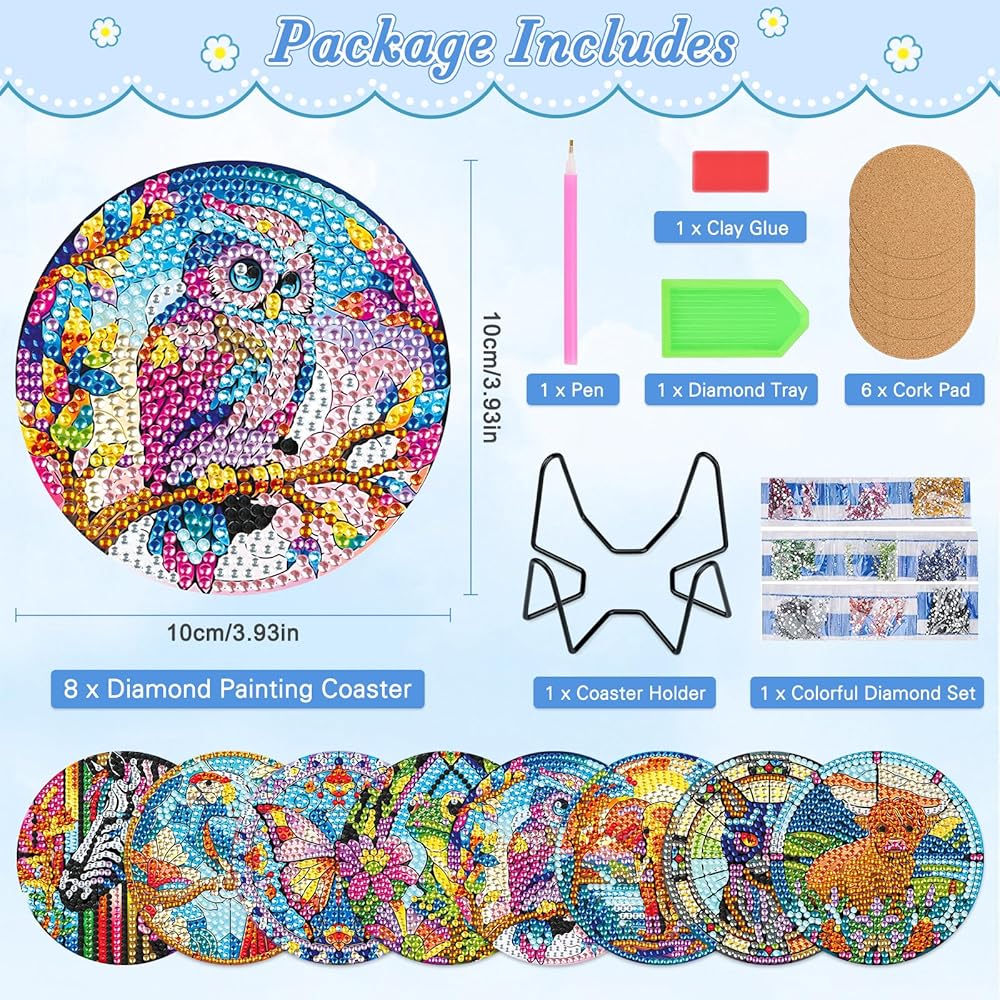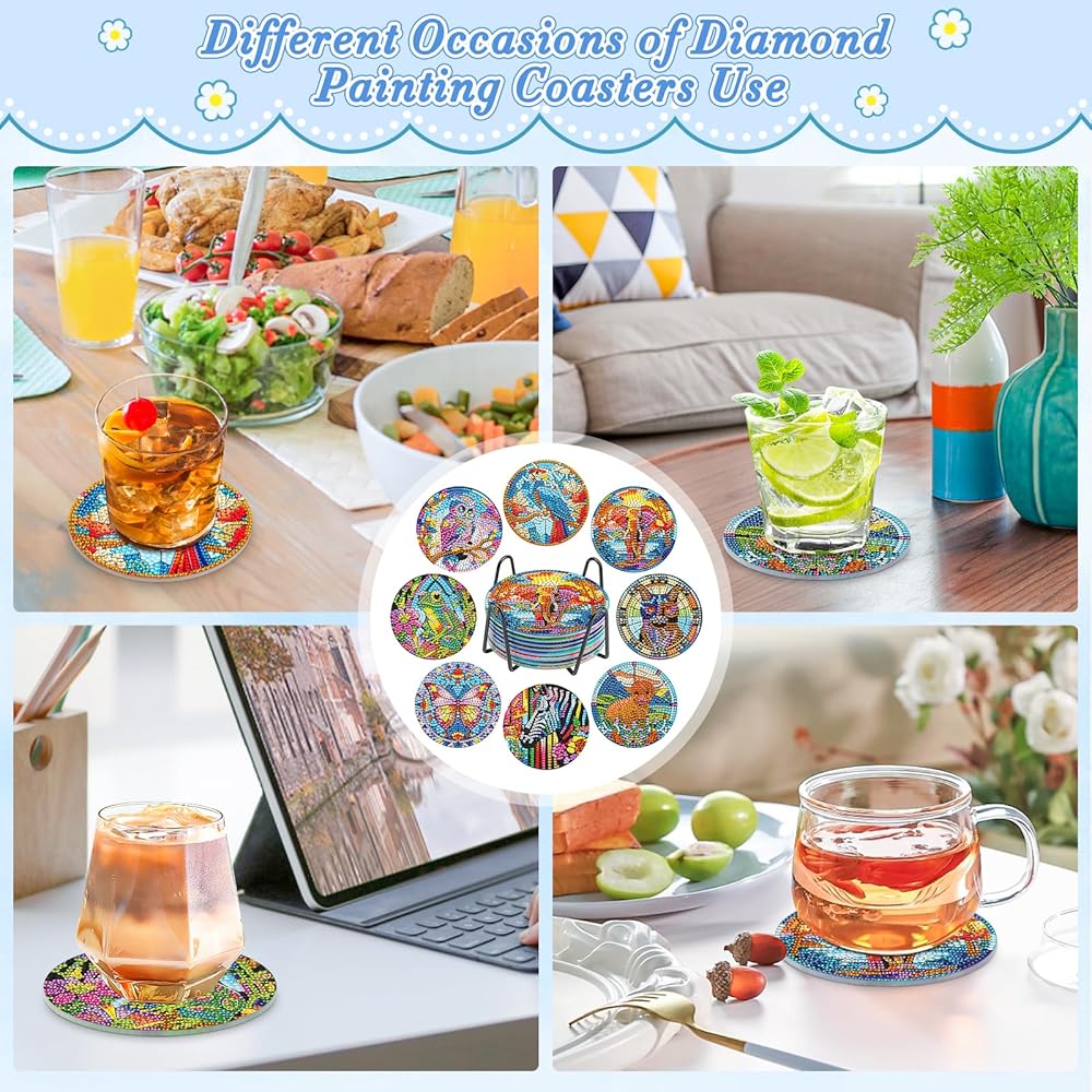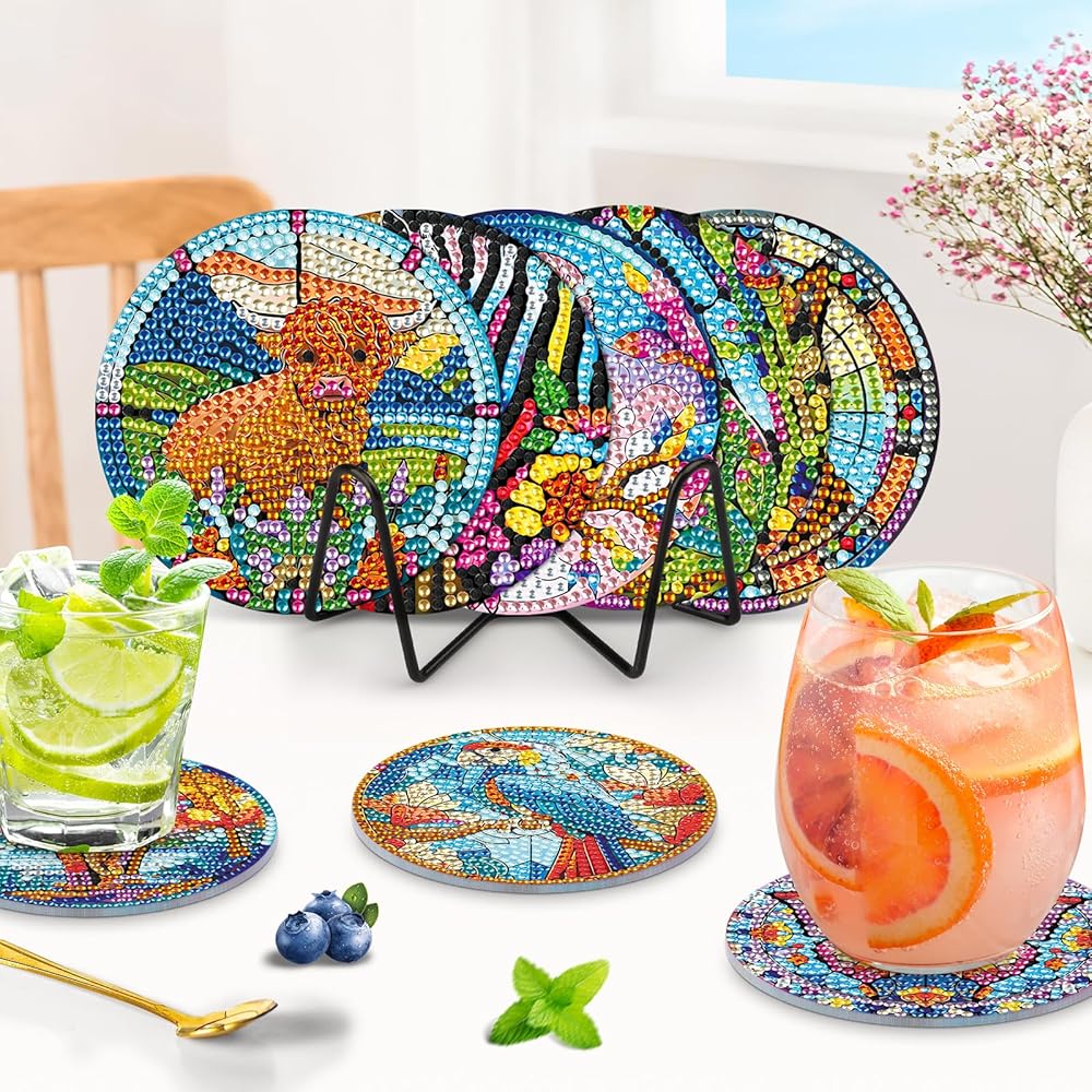 8 قطع من قواعد الأكواب الفنية الماسية مع حامل، مجموعات قواعد الأكواب الفنية الماسية على شكل حيوانات خماسية الأبعاد للبالغين المبتدئين، لوحة أكواب مستديرة من الألماس DIY للبالغين، هدايا عيد الميلاد لديكور المنزل