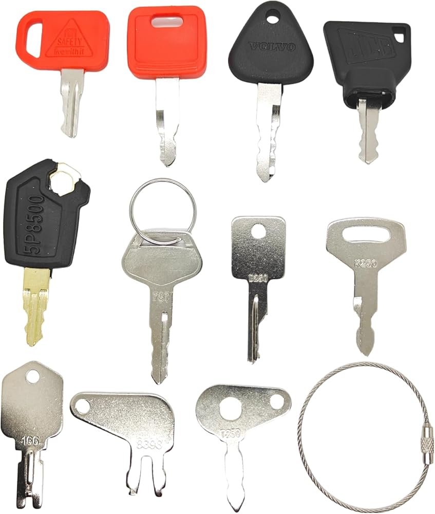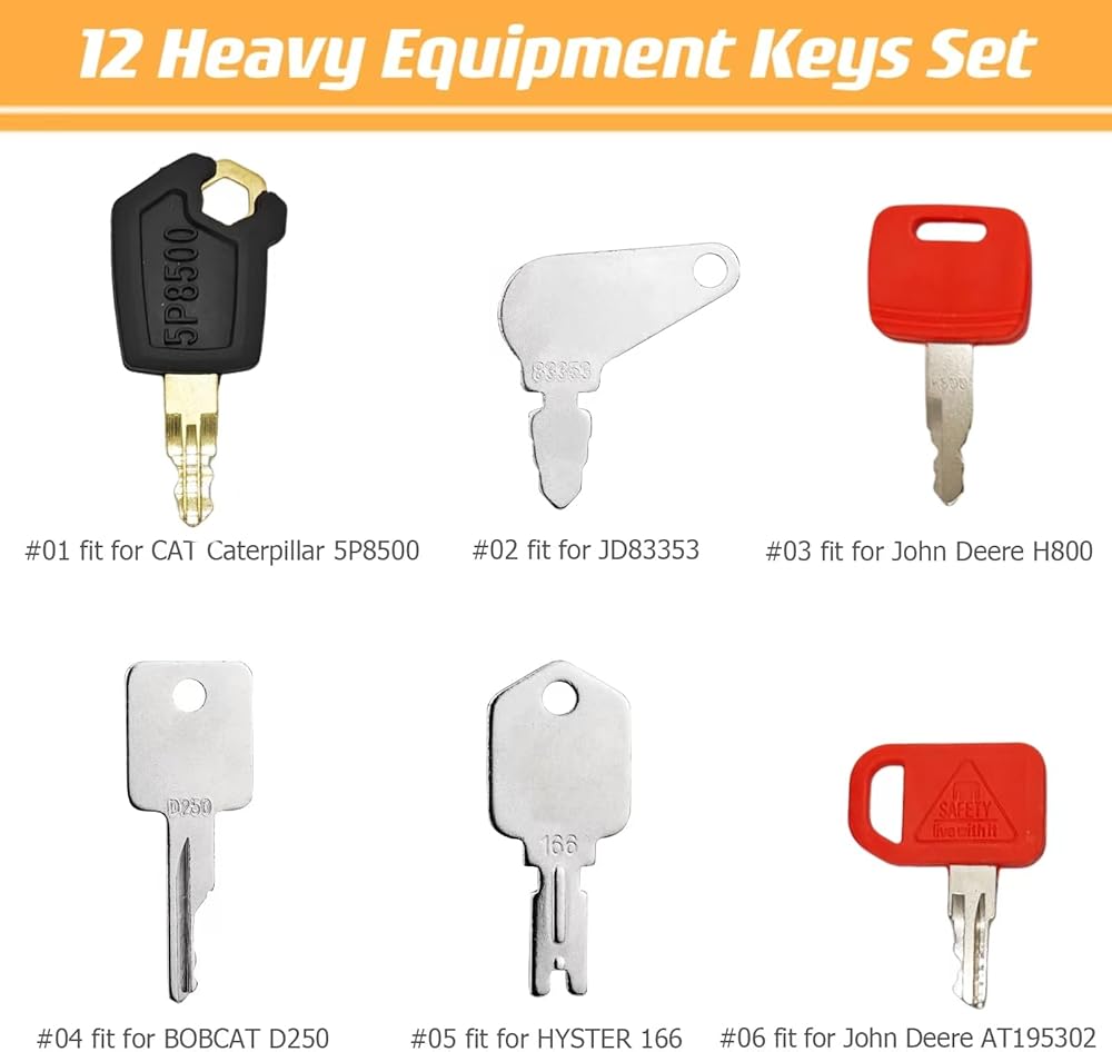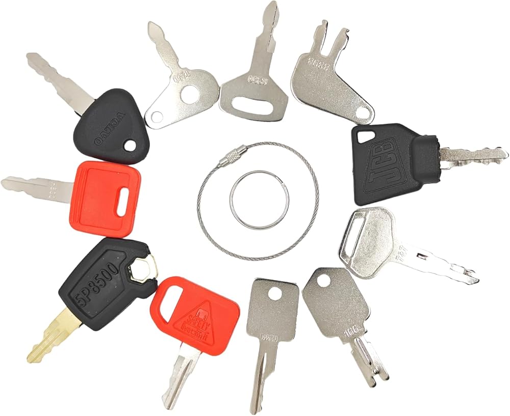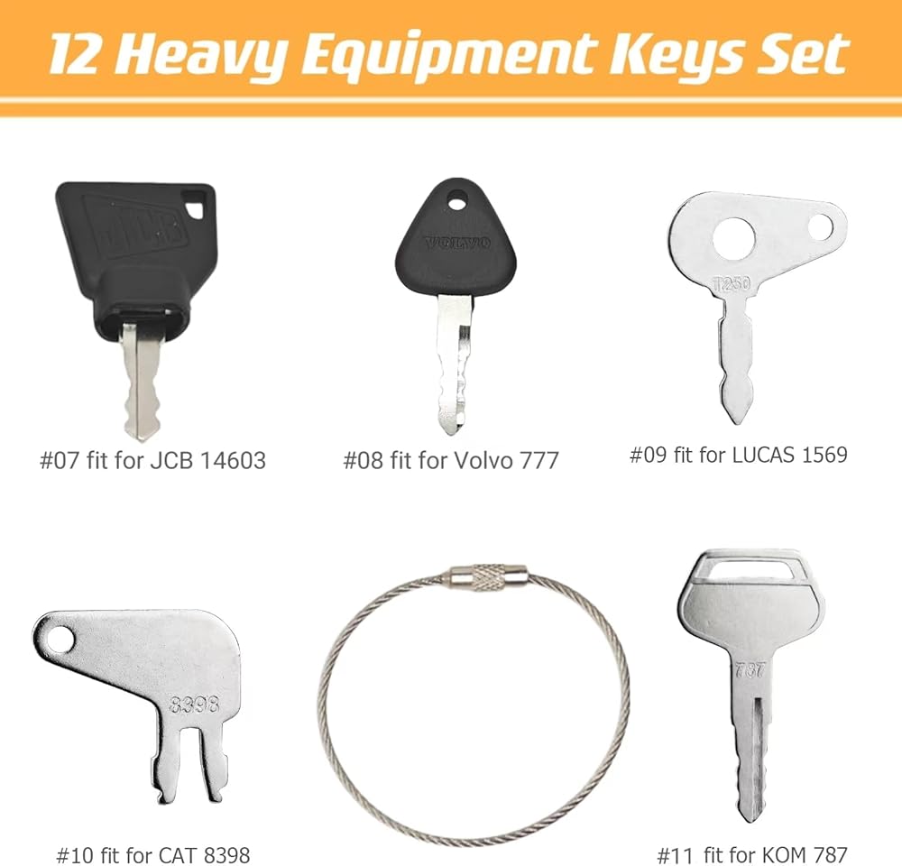 الحزمة: ① 11 مجموعة مفاتيح الإشعال لمعدات البناء الثقيلة ② سلك مفتاح كبير ③ حلقة مفاتيح كبيرة.