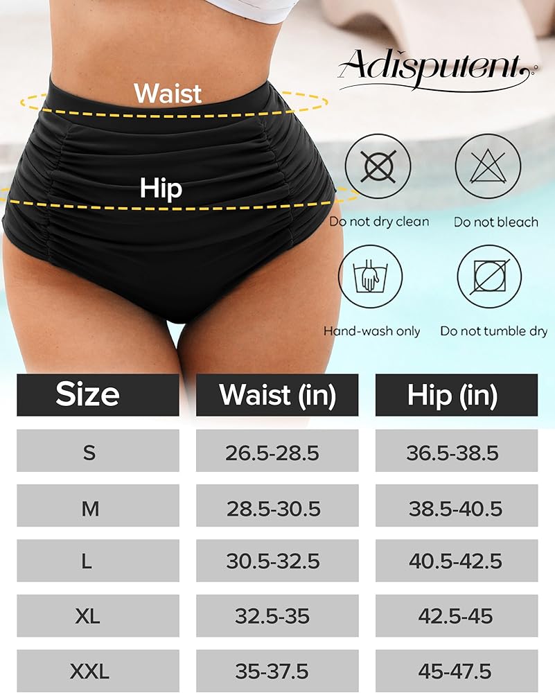 نصائح: يرجى غسل الجزء السفلي من بدلة السباحة ذات الخصر العالي يدويًا بالماء البارد، ولا تستخدم المبيضات أو التجفيف في درجة حرارة عالية.