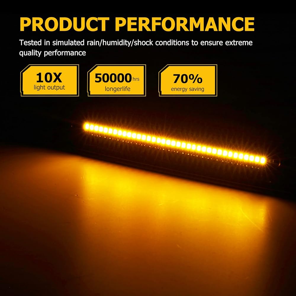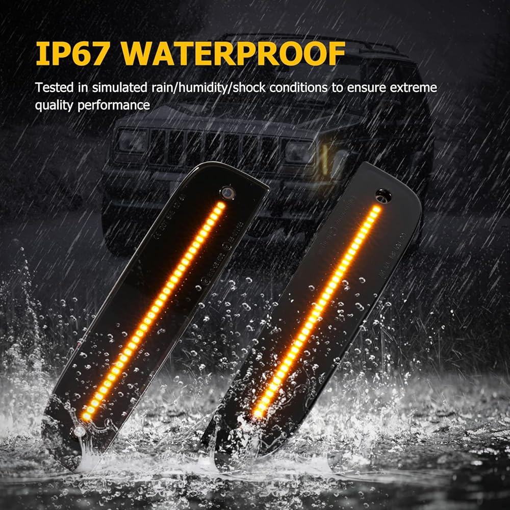 فائقة السطوع: تتميز مصابيح التحديد الجانبية الأمامية بمصابيح LED كهرمانية تحل محل المصابيح المتوهجة الأصلية. وهذا يوفر سطوعًا أكبر بثلاث مرات من مصابيح الهالوجين، مما يجعل سيارتك أكثر وضوحًا وأكثر أمانًا على الطريق. بالإضافة إلى ذلك، فإن مصابيح LED معتمدة من DOT & SAE.