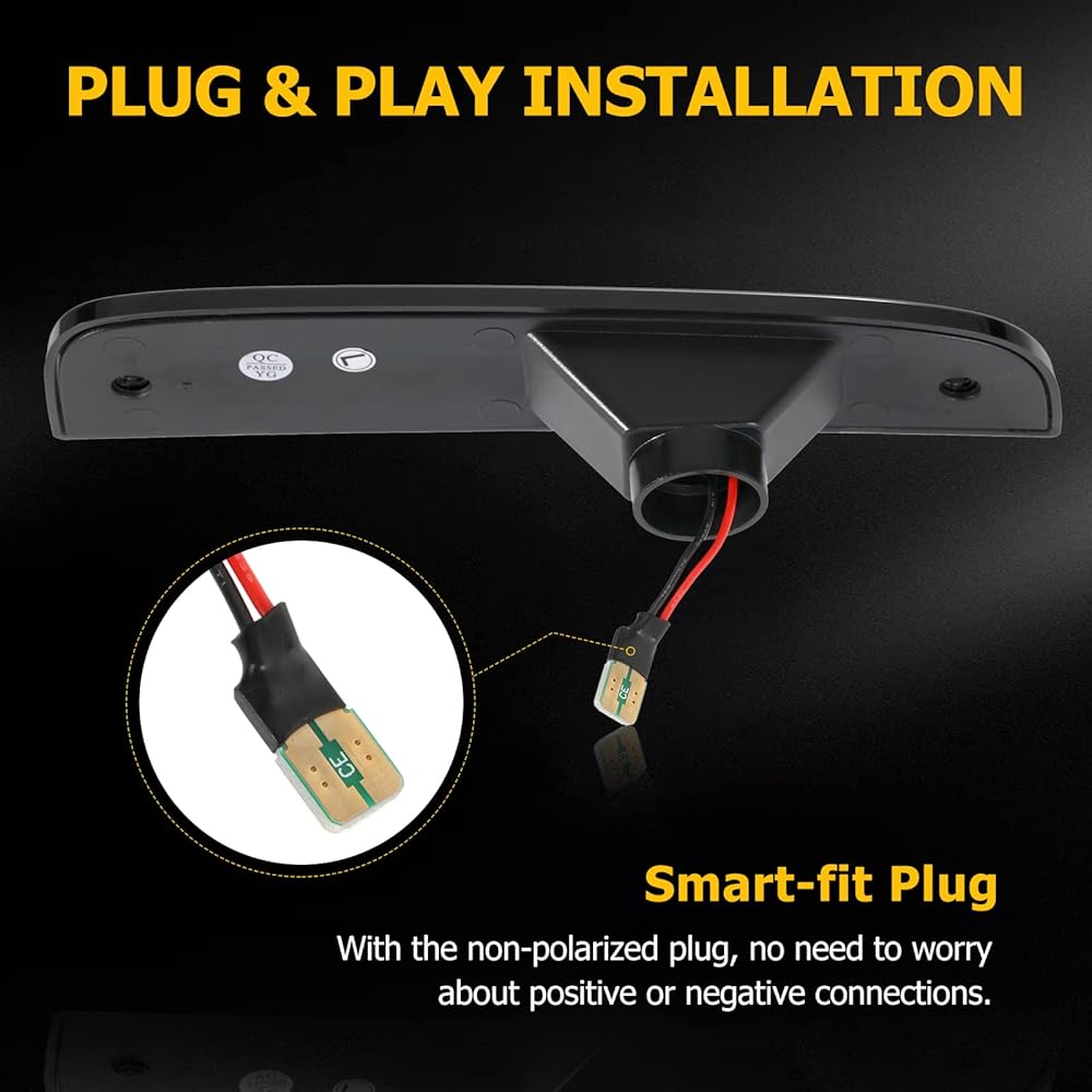 سهلة التركيب: تم تصميم مصابيح التحديد الجانبية للتركيب البسيط للتوصيل والتشغيل، دون الحاجة إلى تعديل. وهذا يجعل من السهل عليك ترقية إضاءة LED الجانبية لسيارتك لزيادة الأمان والأناقة في الليل.