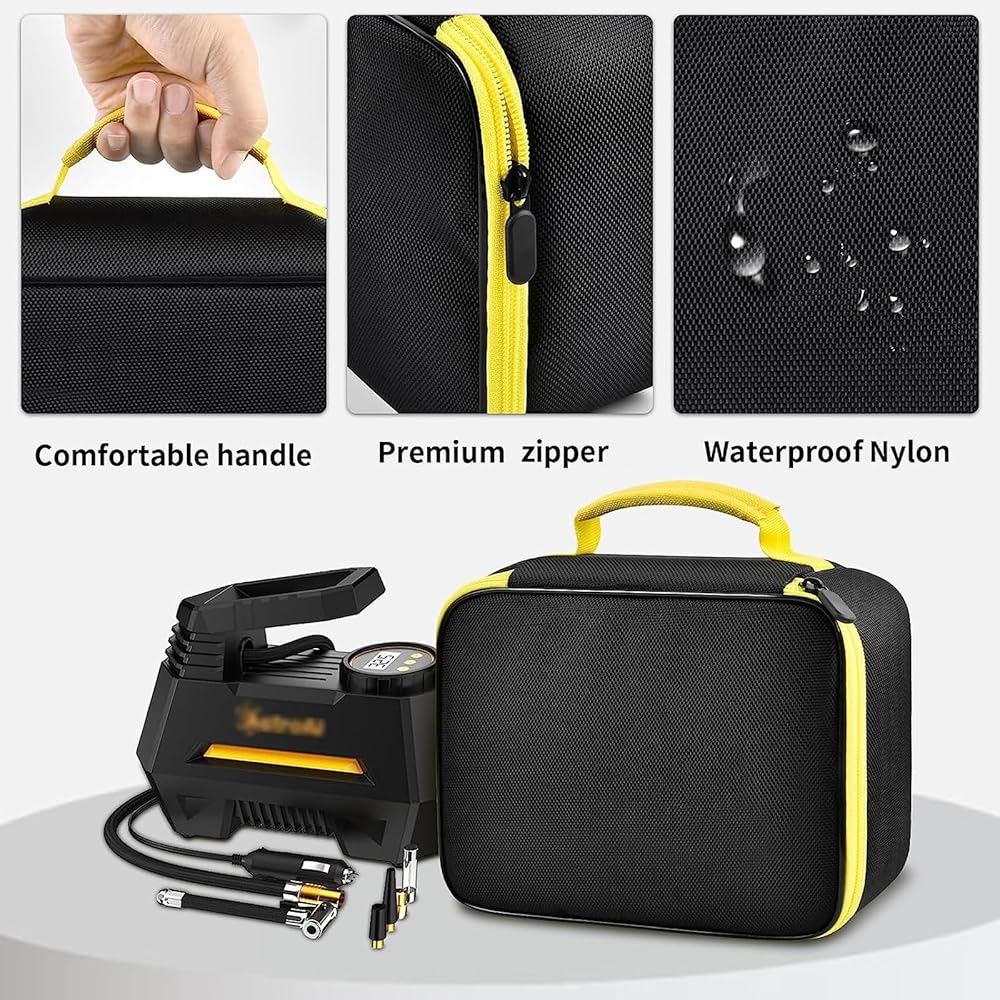 • حقيبة مضخة هواء إطارات السيارة تناسب تمامًا: تم تصميم ضاغط الهواء المحمول لمنظم إطارات السيارة خصيصًا لضاغط الهواء منفاخ الإطارات AstroAI. حامل ضاغط الهواء المحمول هو بالتأكيد ملحق يجب اقتناؤه لتخزين وحماية مضخة الهواء الخاصة بك للسيارة ومعدات الإصلاح. (ملاحظة: صندوق مضخة هواء السيارة فقط، باستثناء منفاخ الإطارات المحمول والملحقات الأخرى)
