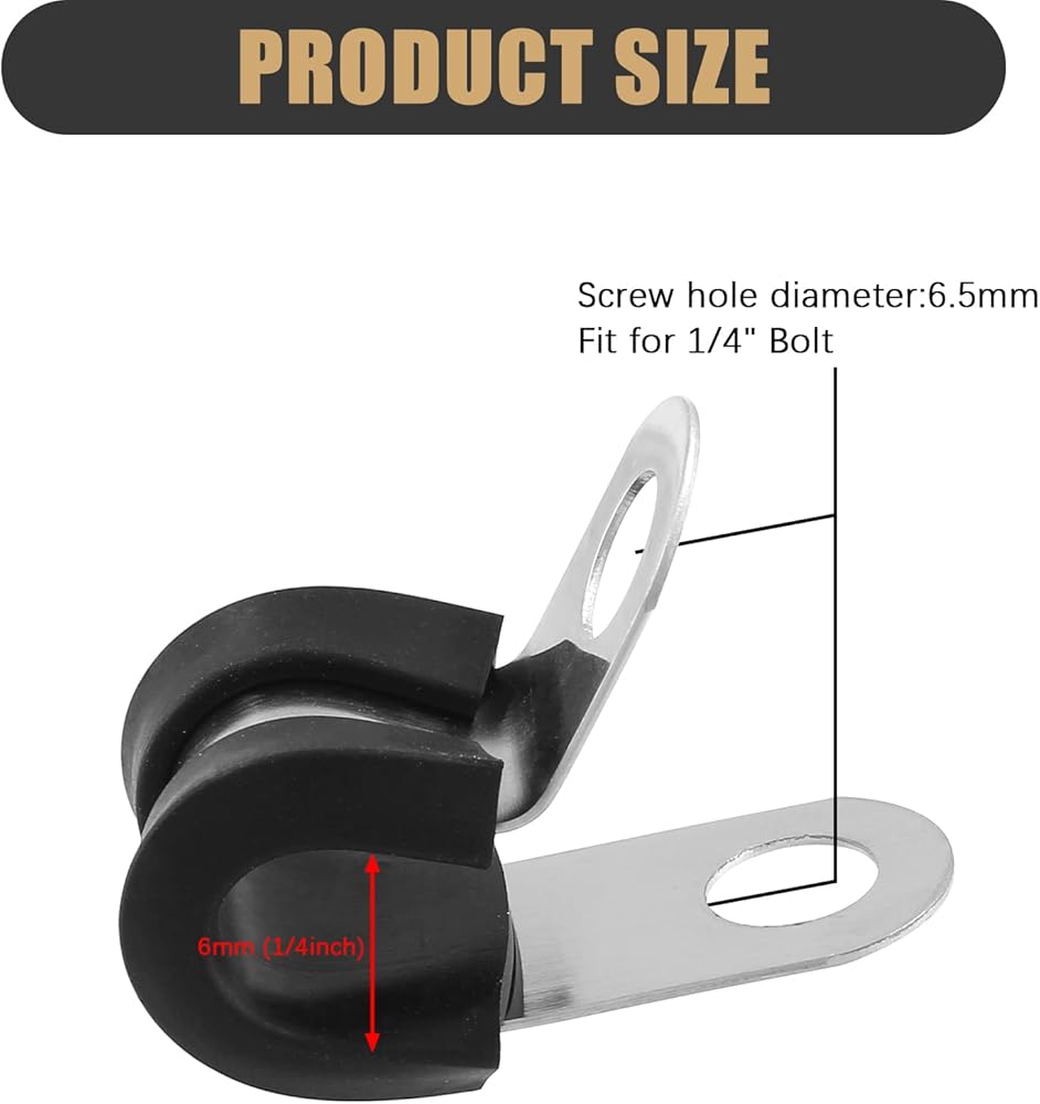 Package & Size: 20 Pcs cable clamps. Inner Diameter: 6mm (1/4inch). The screw hole diameter is 6.5mm, suitable for M6 (1/4 ") bolts. A large enough quantity can meet your installation needs, and the P-type design makes the fixture stylish and practical.
