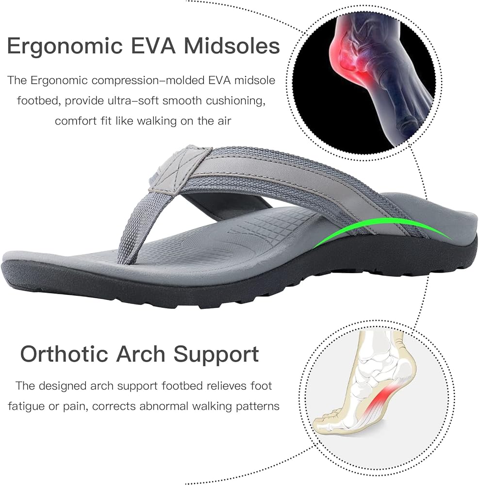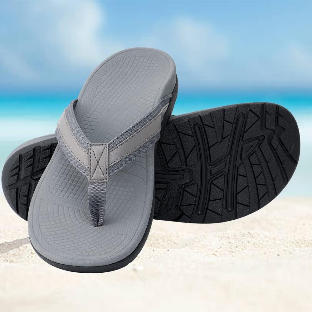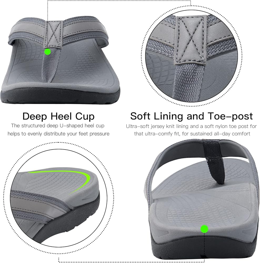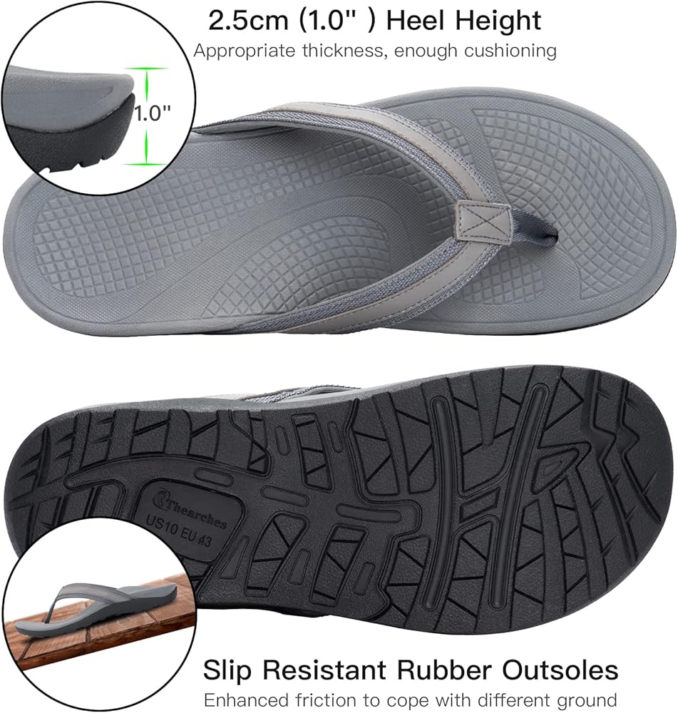 • DEEP HEEL CUP: Thearches thong sandals are designed with a structured deep U-shaped heel cup. It helps to evenly distribute your feet pressure, improves foot and leg alignment, enhances comfort, and realigns the skeletal system to protect their heel during the severe impact of landing. In other words, it can provide extra support and stability while walking or standing and also prevent sliding and add friction during high impact.