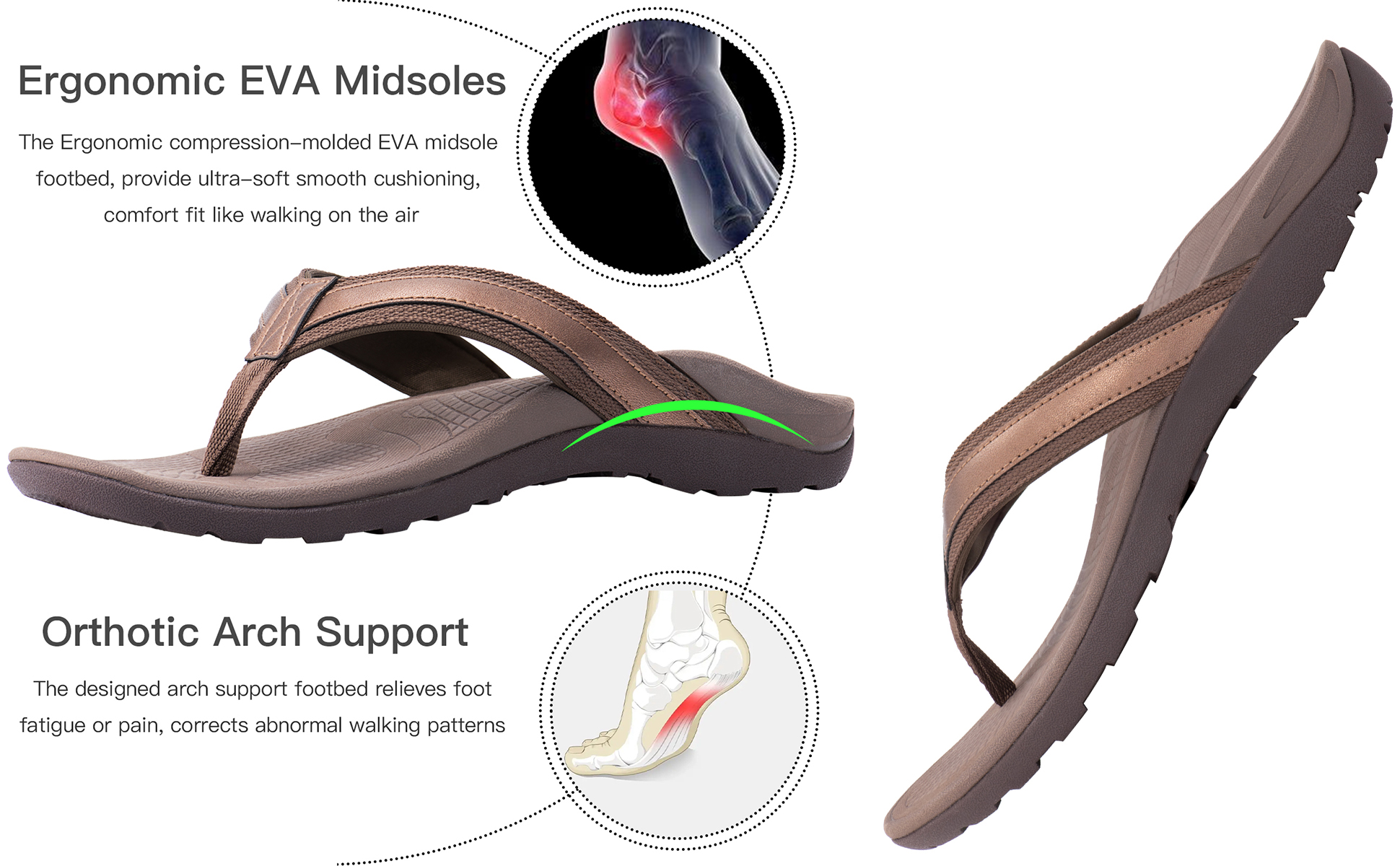 • MATERIAL & DESIGN: The orthotic flip-flops include hand-sewn straps & sofer lining, double sole shock absorption, and slip-resistant footbed, to bring some extra fun and expression to our classically comfortable sandal. The curve of the footbed is designed in accordance with the foot structure, out of doctor's data from patients and Ergonomic knowledge. You'll feel the support for arches and heels is on point, providing better cushioning and long-lasting support for every step.