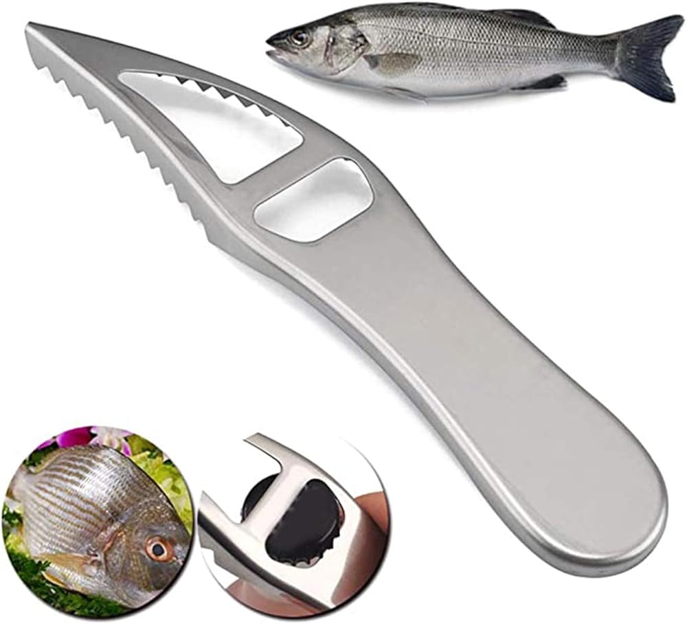 تصميم السلامة: مزيل قشور السمك من الفولاذ المقاوم للصدأ 304 عالي الجودة وآمن للطعام، مقبض غير قابل للانزلاق مصمم بشكل مريح وقوي. قشارة السمك الآمنة لعائلتك.