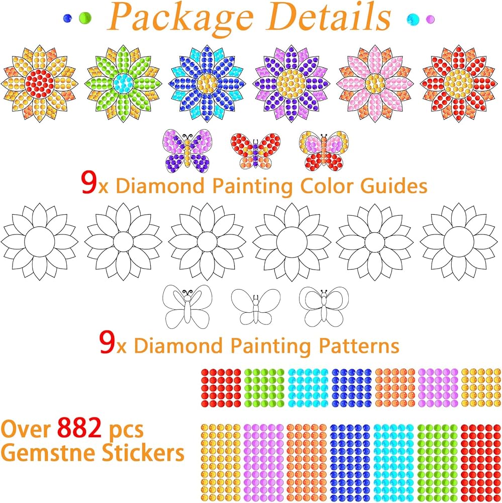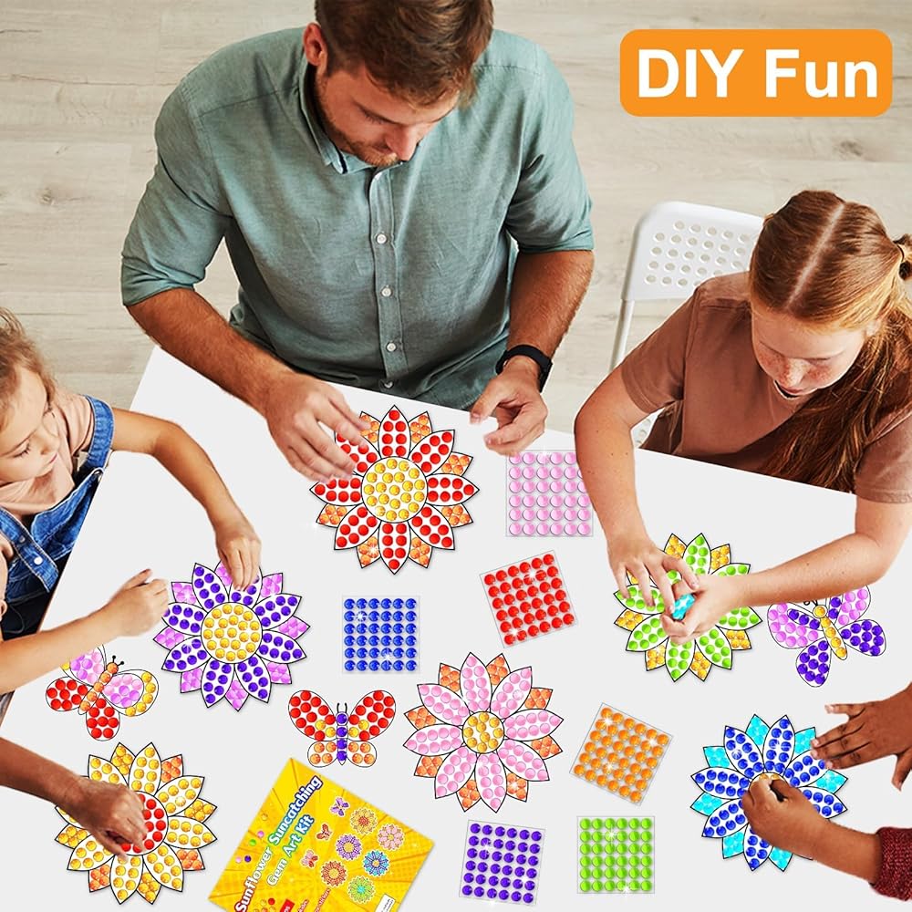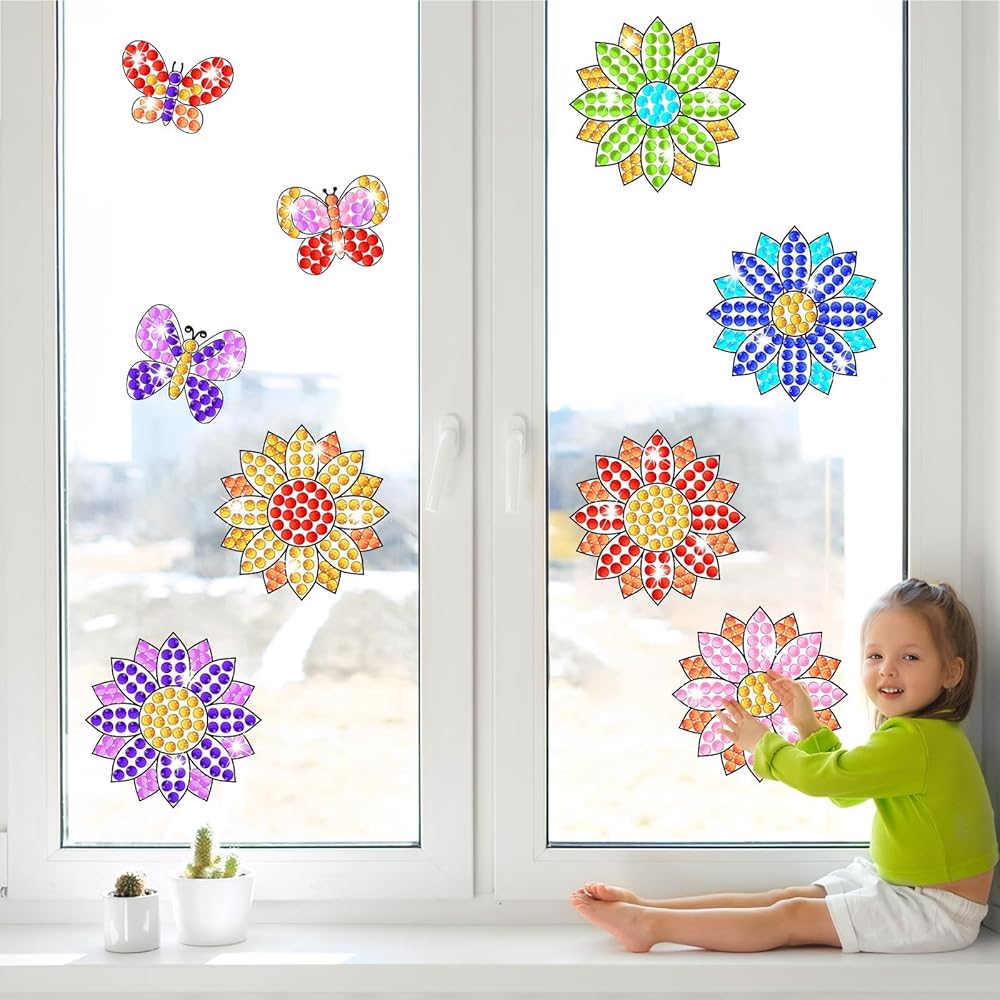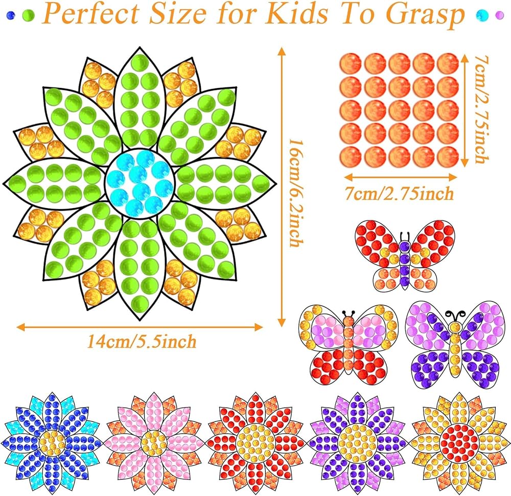 • مجموعة Spring Suncatcher Gem Craft Kit: تتضمن الحزمة 9 تصميمات مطبوعة على شكل عباد الشمس والفراشات، و9 بطاقات دليل الألوان، و882 ملصقًا من الأحجار الكريمة، وورقة من النقاط اللاصقة، وحبل ذهبي، مما يمنح الأطفال إحساسًا بالربيع.