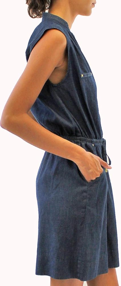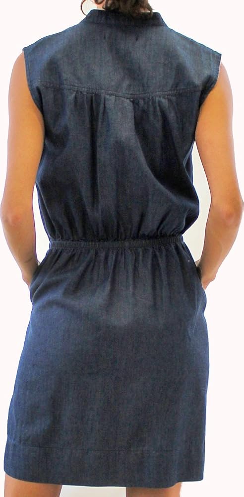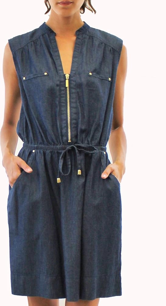 This denim dress features a classic body style, an elastic drawstring waistband, a v-neck collar, and a zipper closure.