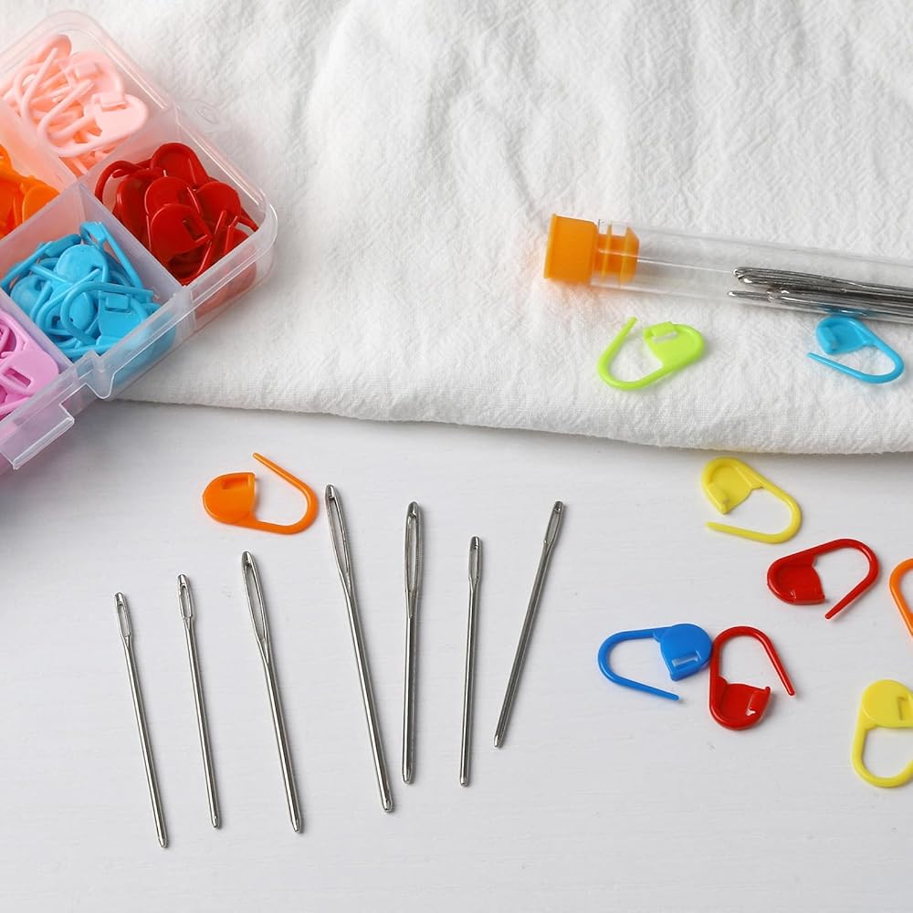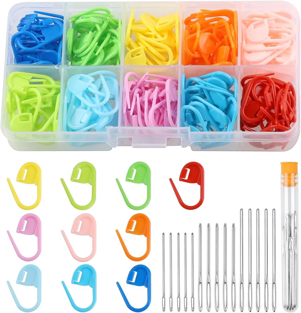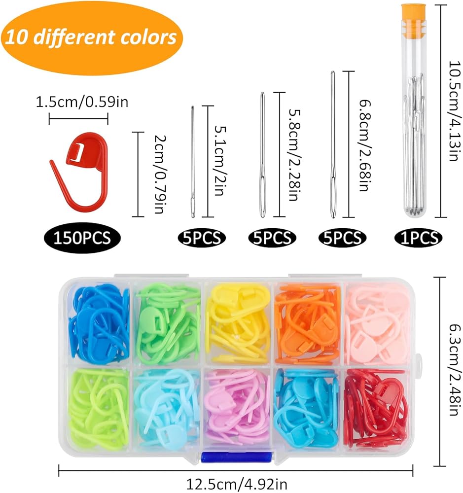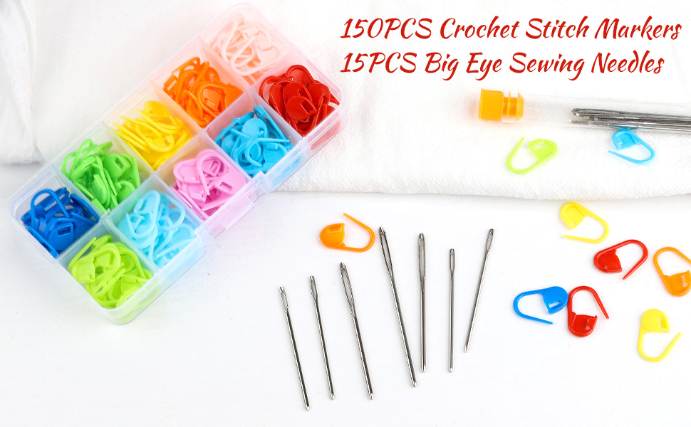 BLMHTWO 150 قطعة من علامات الغرز، 10 ألوان لحياكة الكروشيه مع 3 أحجام، 15 قطعة من إبر الخياطة الحادة للعيون الكبيرة لعلامة ملابس الحياكة مع صندوق تخزين