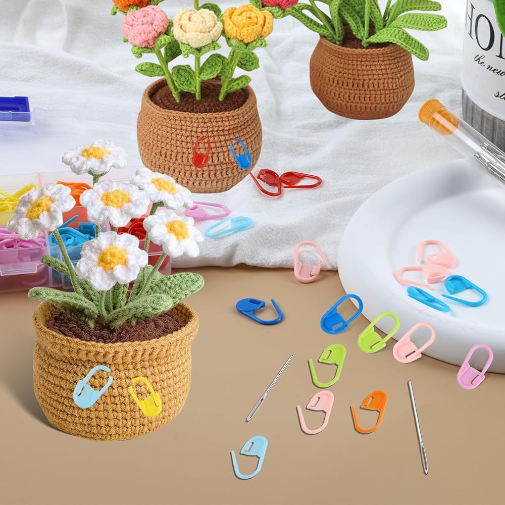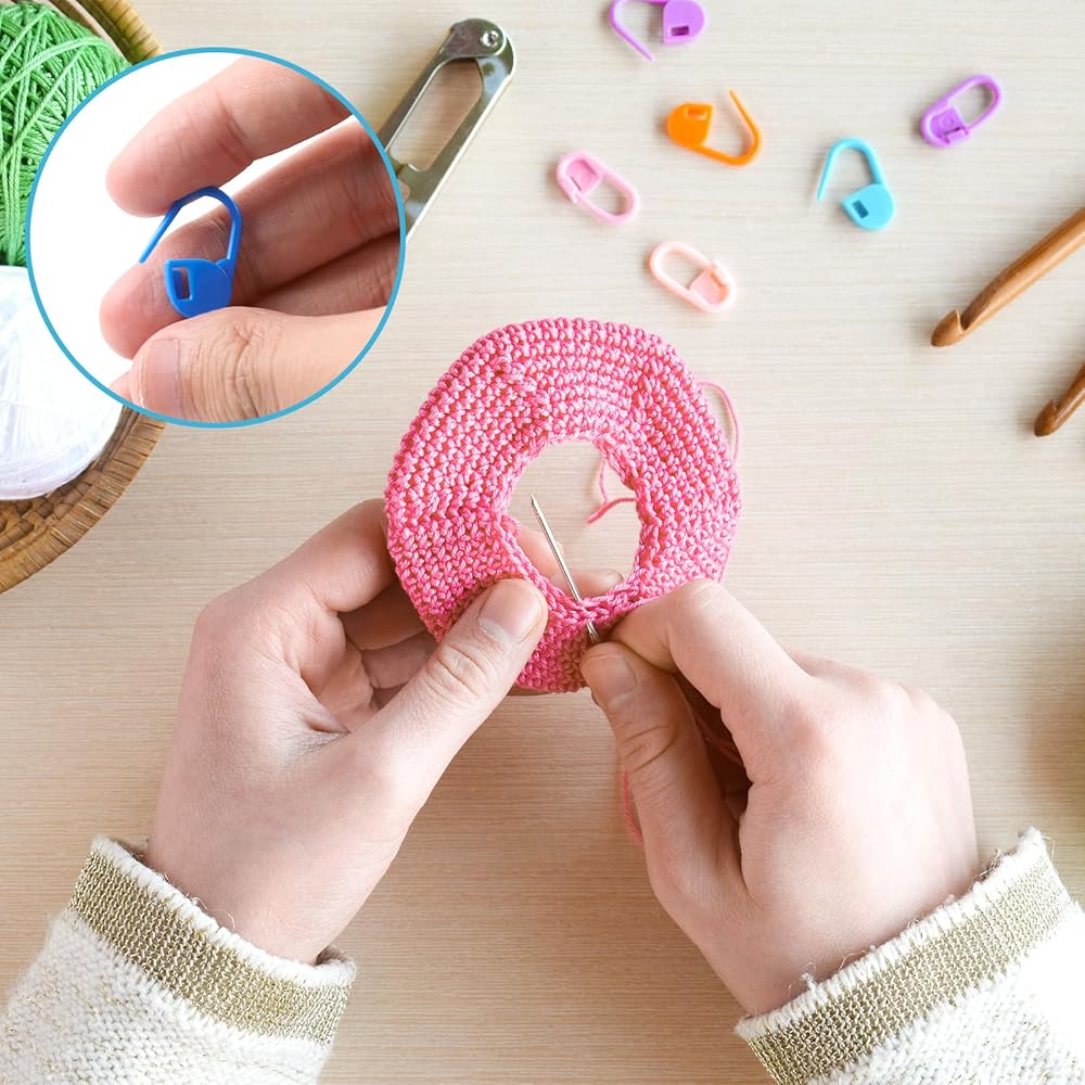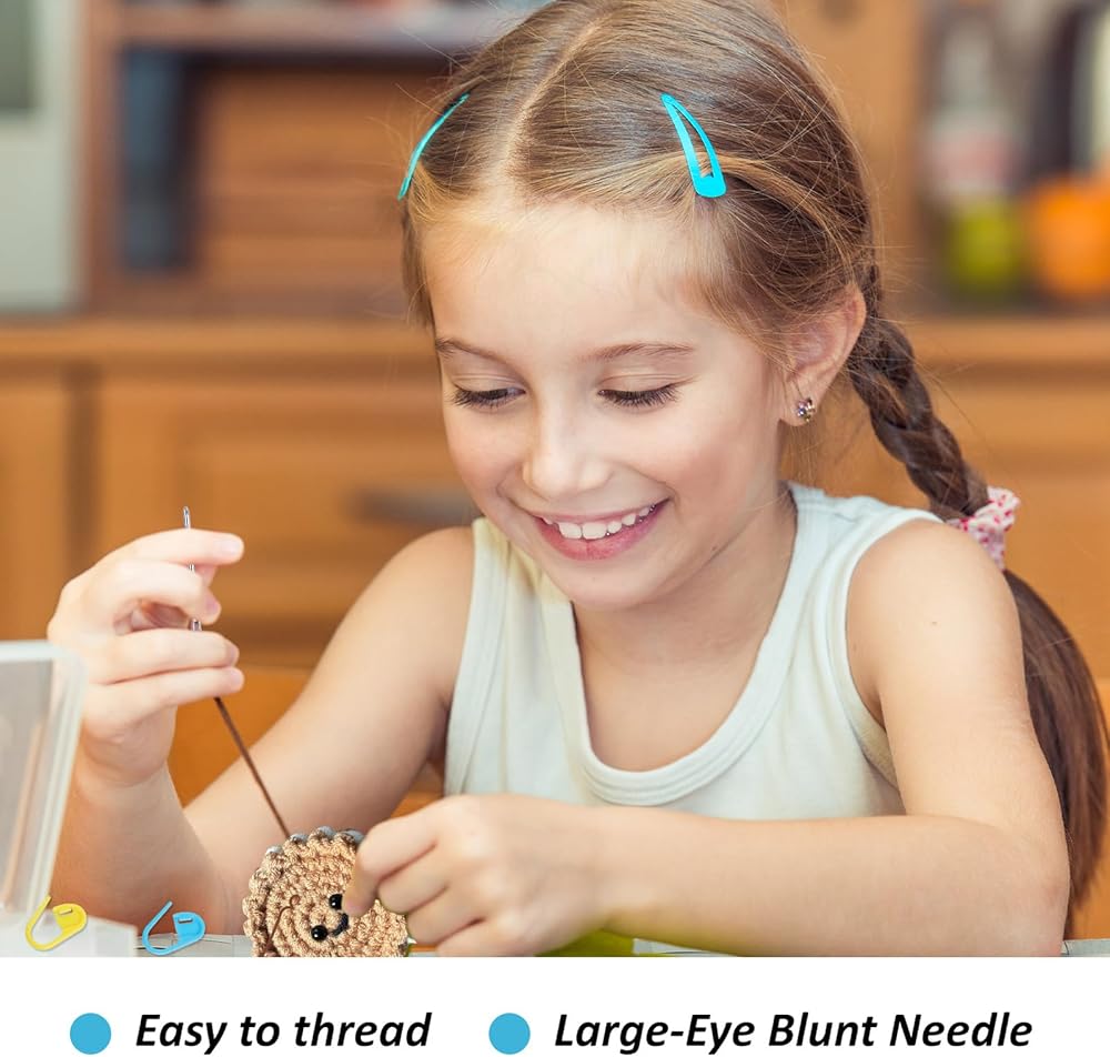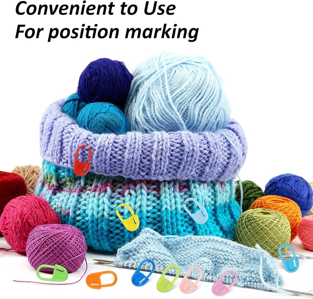 BLMHTWO 150 قطعة من علامات الغرز، 10 ألوان لحياكة الكروشيه مع 3 أحجام، 15 قطعة من إبر الخياطة الحادة للعيون الكبيرة لعلامة ملابس الحياكة مع صندوق تخزين
