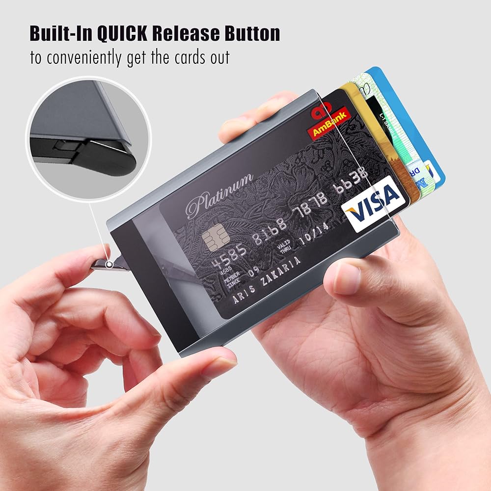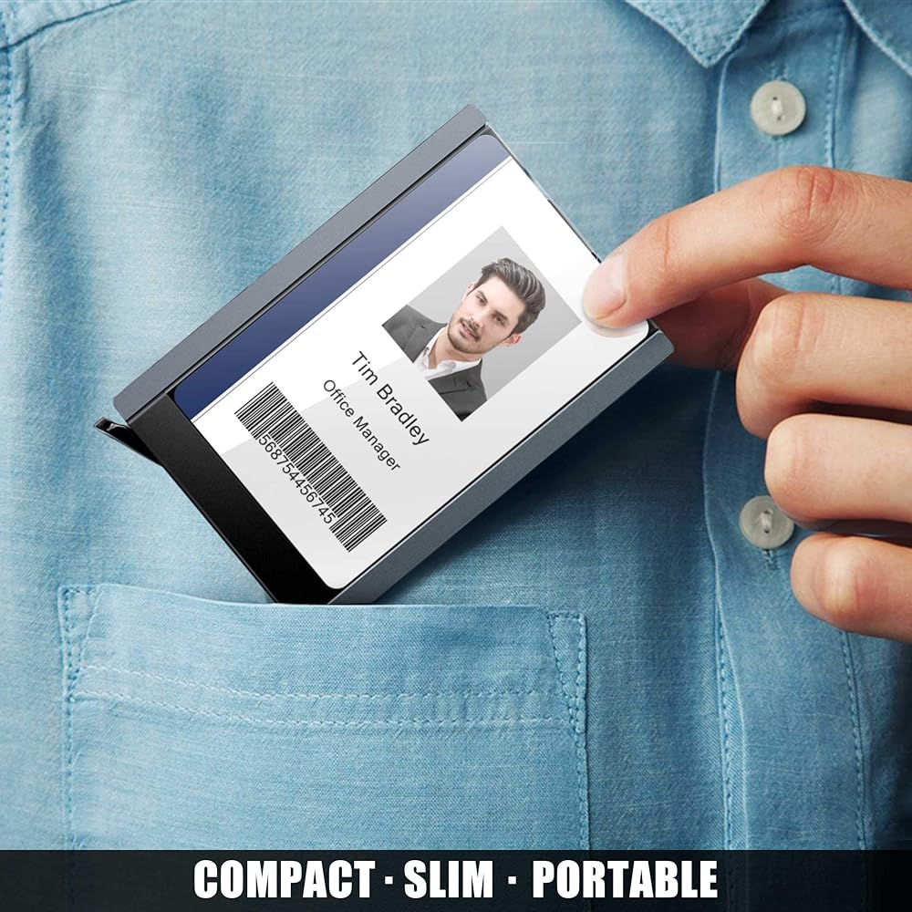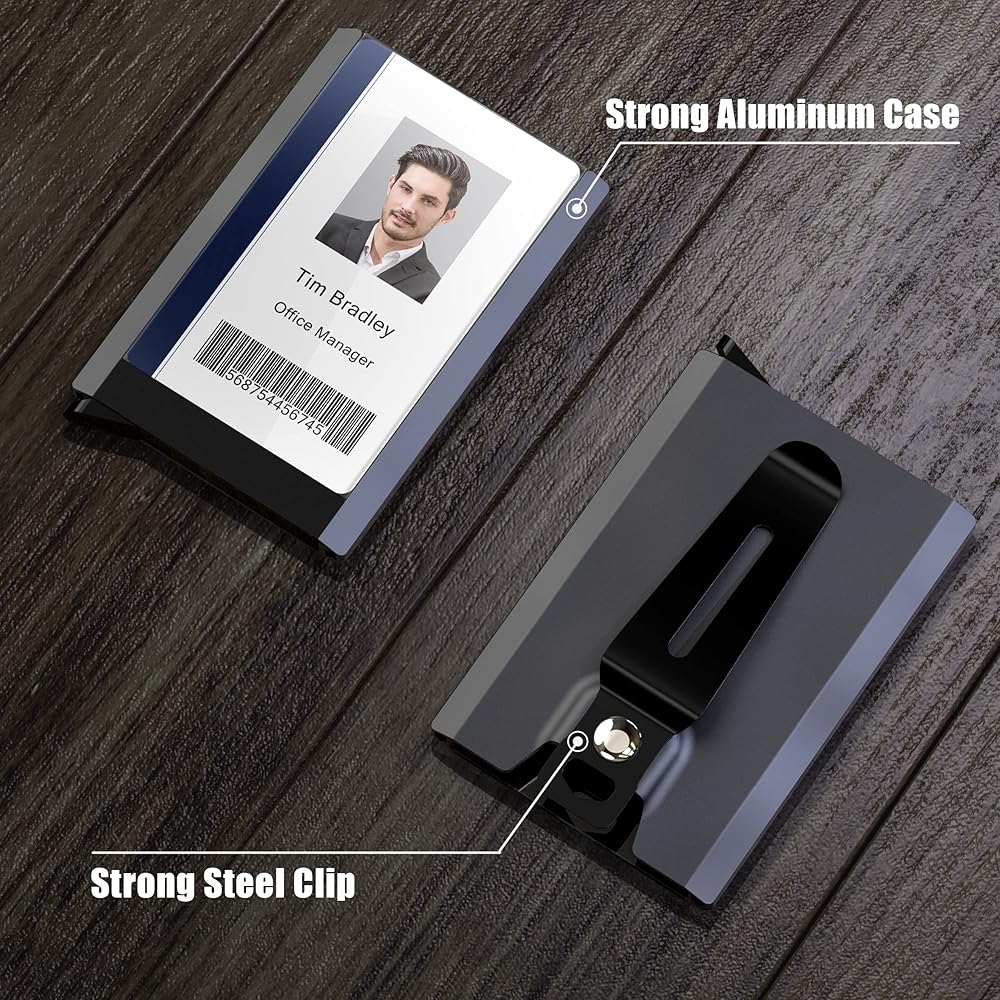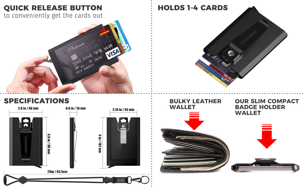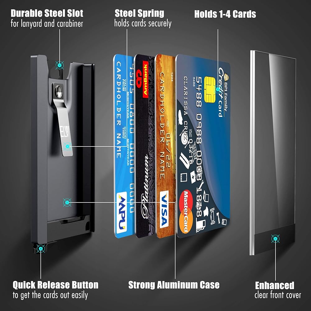 تحميل علوي من 1 إلى 4 بطاقات - يتم تحميل جميع البطاقات من الجزء العلوي من الحافظة الصلبة القوية (يمكن أن تحمل 4 بطاقات ائتمان قياسية / شارات بحجم رخصة القيادة). بغض النظر عن أنها محملة ببطاقة واحدة أو أكثر، فإن نظام الإمساك الزنبركي الداخلي يحمل البطاقات بأمان. رافعة الإبهام في الأسفل يمكنها تحريك البطاقات لأعلى.