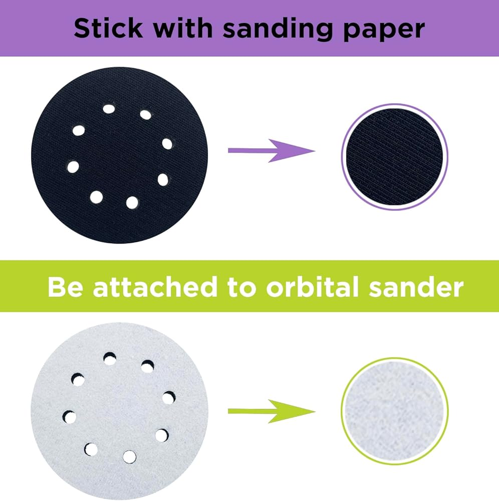 خطاف وحلقة: وجه خطاف أسود يمكن لصقه بورق الصنفرة، ووجه حلقة أبيض يمكن ربطه بآلة الصنفرة المدارية