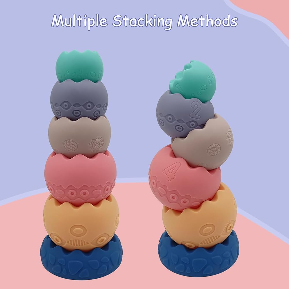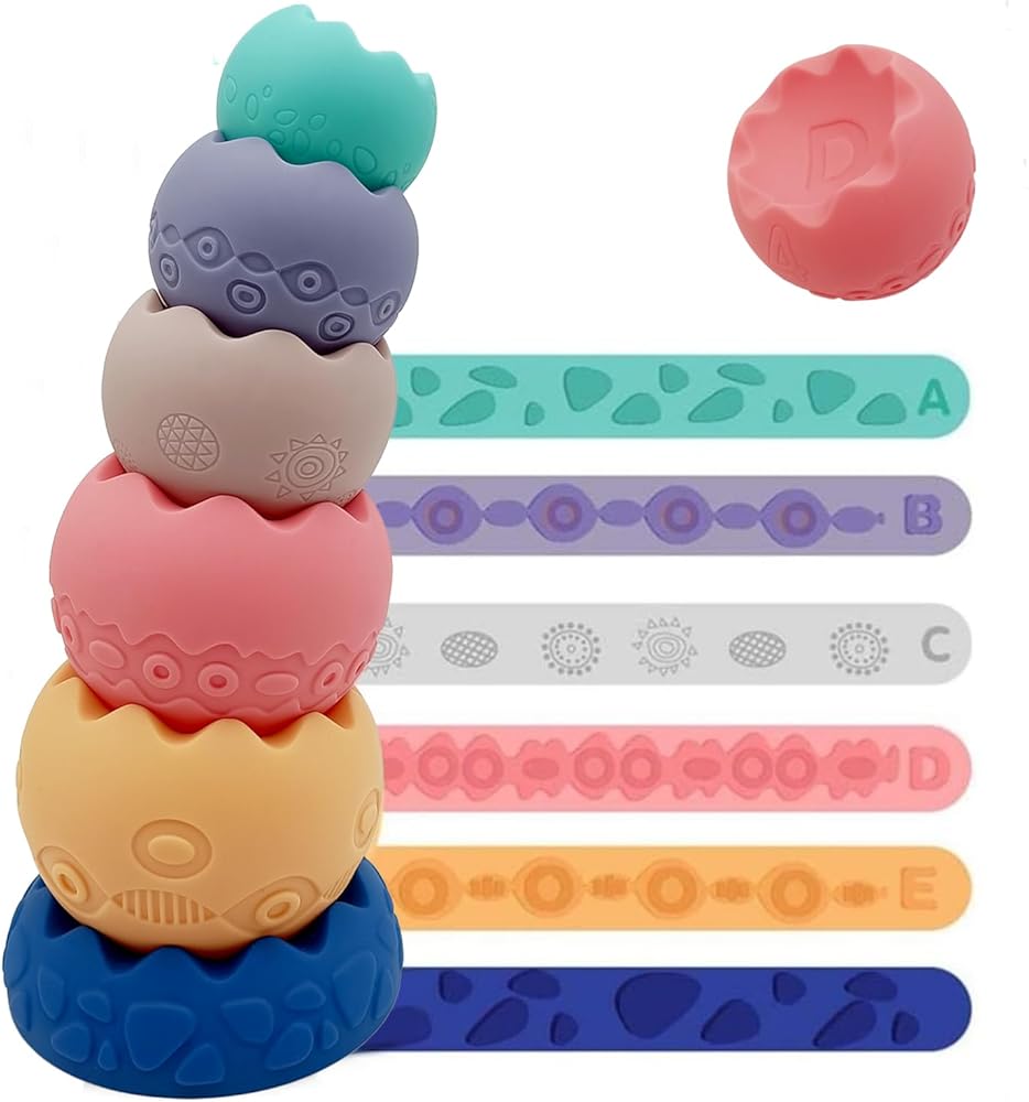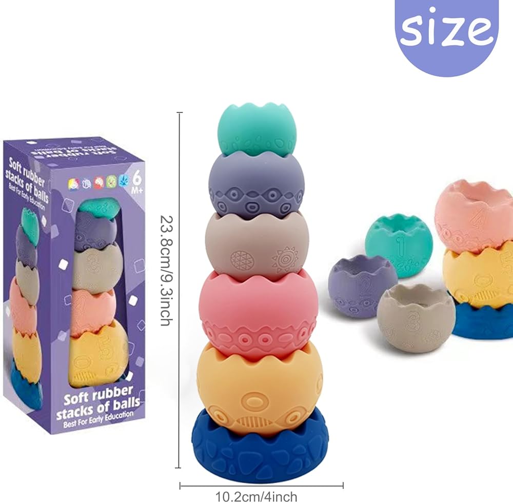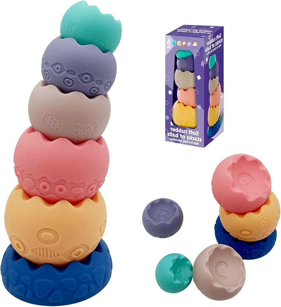 Stack the Ball - Stacking toy has five eggshell shaped stackable spheres that come in graduated sizes, nesting into each other at gravity-defying angles. The base allows your child to balance them as they build their wobbly, colorful tower. Ages 6+ months.