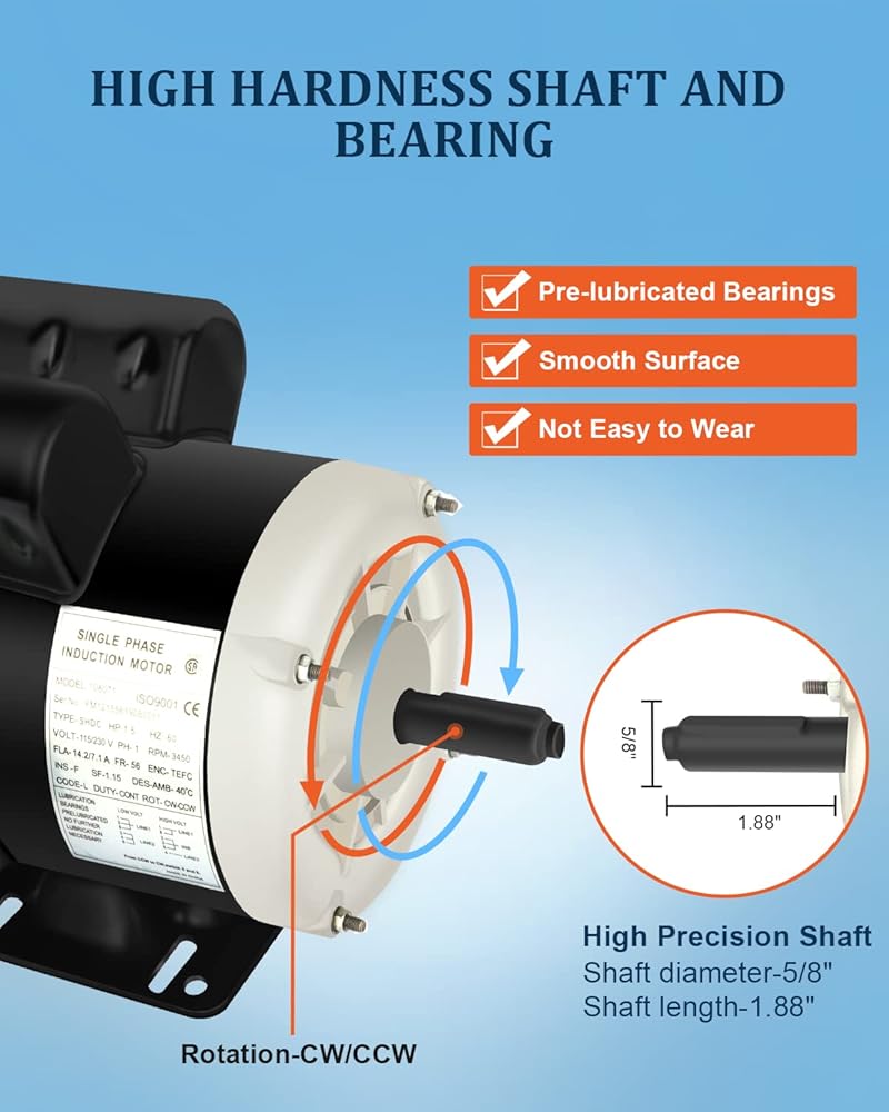 • 💡محرك كهربائي عام: HP - 1.5، POLE - 2، FRAME -56، ENC -TEFC، IP - 55، محرك كهربائي أحادي الطور يتمتع بكفاءة عمل عالية. الجهد الكهربائي: 115 فولت/230 فولت، أمبير: 14.2 أمبير / 7.1 أمبير، دورة في الدقيقة: 3450، INS - F، الدوران - CW/CCW، قطر العمود ذو المفتاح - 5/8، طول العمود - 1.88.