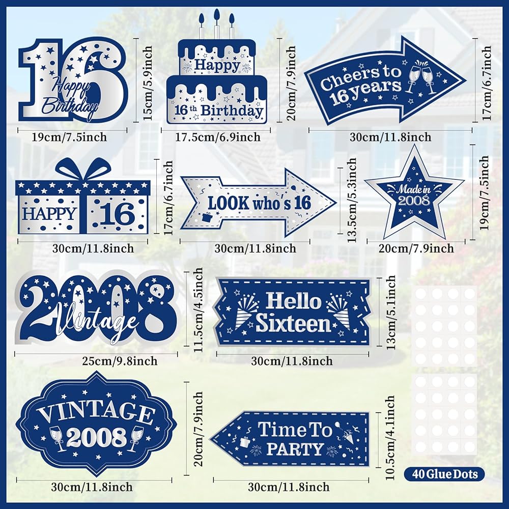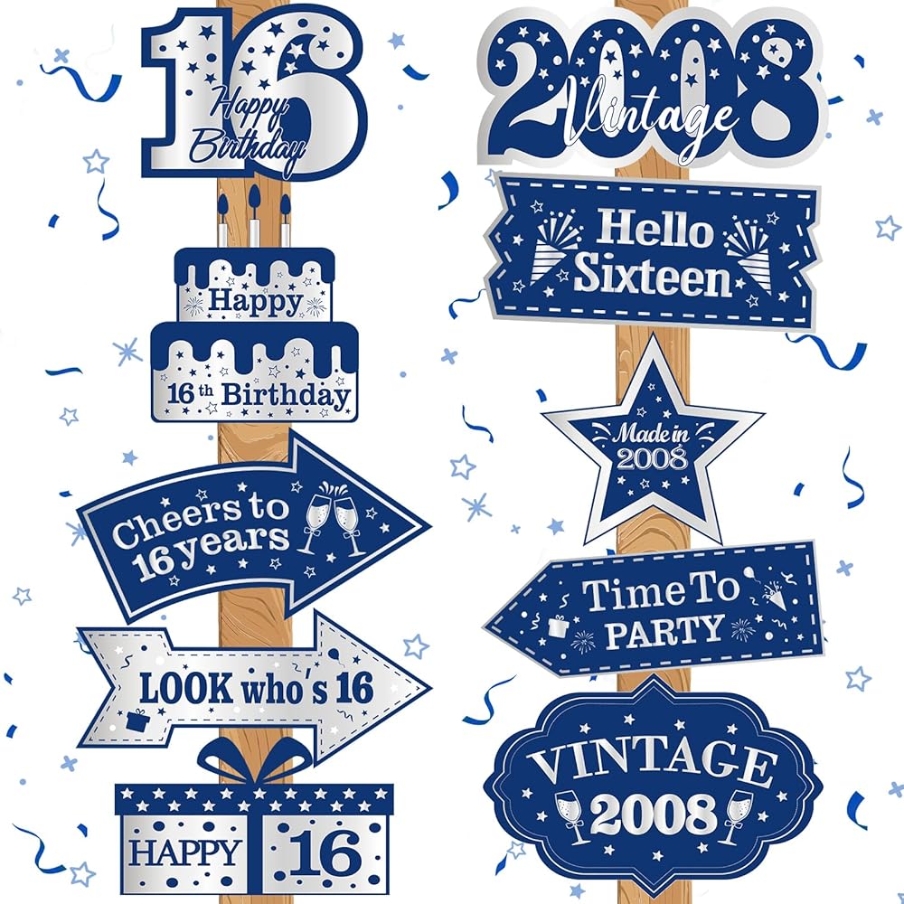 🎊【Design】The blue 16th birthday door decorations are designed with many slogans, such as Cheers to 16 Years, LOOK Who's 16, Time to PARTY, Vintage 2008, Hello Sixteen, etc, which can add to the party's funny atmosphere. If you put it on a fence or grass, the 16th birthday decorations in blue and silver colors are extra eye-catching.