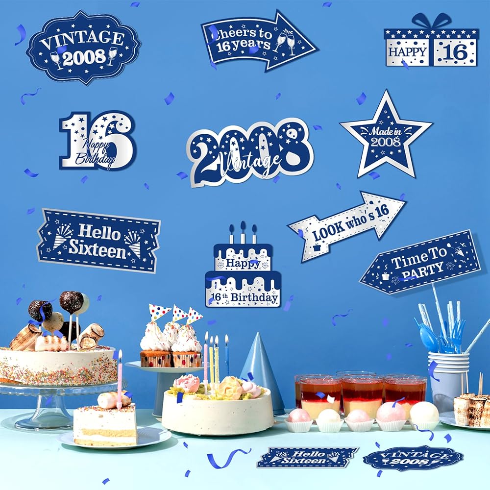 10 قطع من زينة عيد الميلاد السادس عشر باللون الأزرق للأولاد والبنات باللون الأزرق الداكن والفضة السعيدة لعيد الميلاد السادس عشر لافتة باب لافتة علامات اتجاهية عتيقة 2008 ديكورات حفلات أعياد الميلاد16 عامًا لتزيين جدران الحفلات