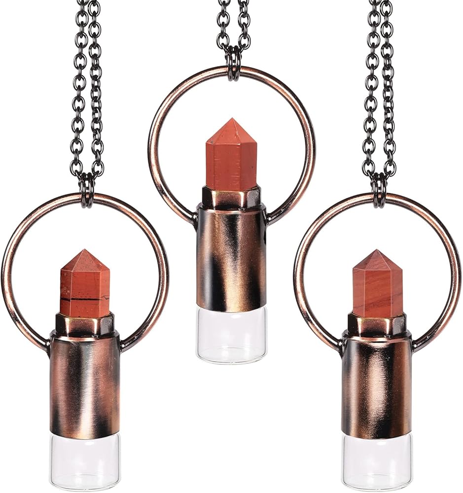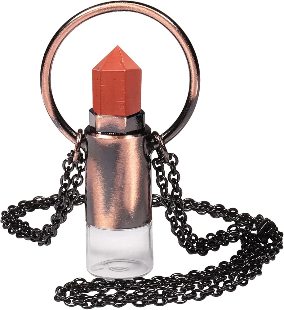 • قلادة بقلادة على شكل قارورة كريستال سداسية الشكل: تشتمل القلادة المتدلية الحجرية لدينا على غطاء زجاجة مصنوع من نقطة الكريستال الطبيعية والنحاس، وزجاجة زجاجية صغيرة مع كرة دوارة كريستالية، وقطارة بلاستيكية وسلسلة من الفولاذ المقاوم للصدأ. القلادة مصنوعة بشكل جيد وأنيقة ومريحة في الارتداء؛ وبما أن الحجر طبيعي، فسوف تحصل على قلادة زجاجة عطر واحدة بلون الحجر وشكله وملمسه المماثل للصور المعروضة.