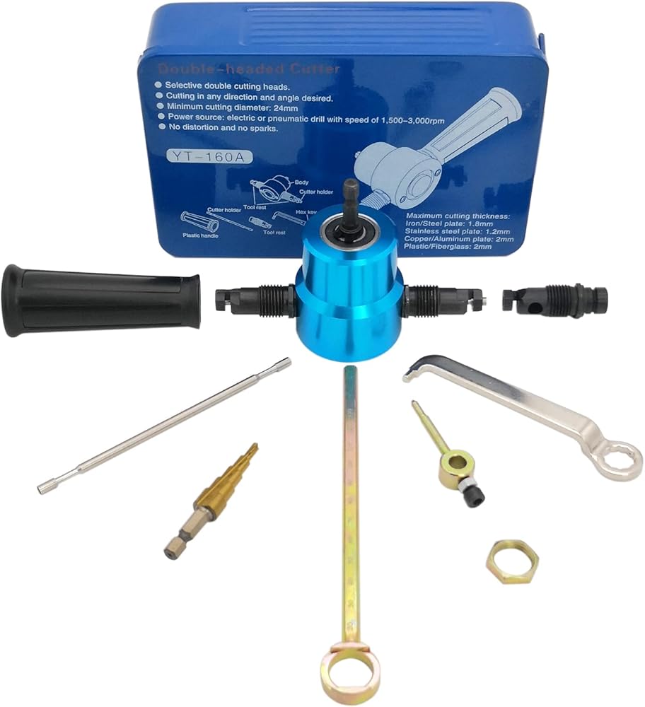 【360 درجة】 يحتوي القاض المعدني ذو الرأس المزدوج على مثقاب قطع 360 درجة، وهو مصنوع من مادة اتش اس اس اس عالية القوة، ويمكنه قص الأشكال التي تريدها، وقطع الخطوط المستقيمة والمنحنيات والدوائر دون ترك نتوءات على الحواف.