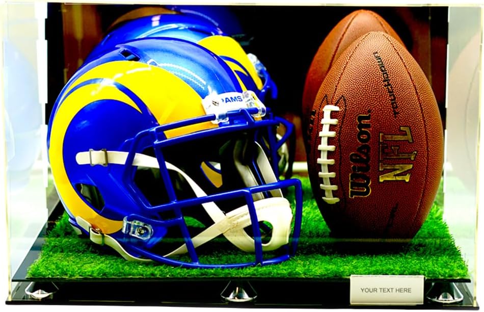 • This unique display case will allow you to include both 1 full size football helmet & football. Features real time artifical grass, 2-Level Riser with silver corner caps, mirrored background, & name plate (3 blank white cards).