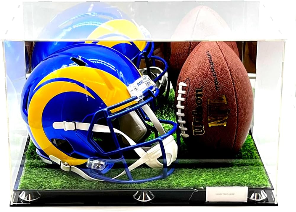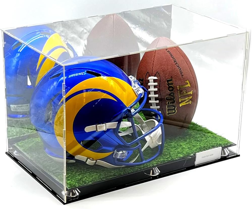Full Size Football Helmet & Ball Acrylic Display Case Box Mirror Artifical Grass Turf 2 Level Riser Showcase Shoes UV Protection