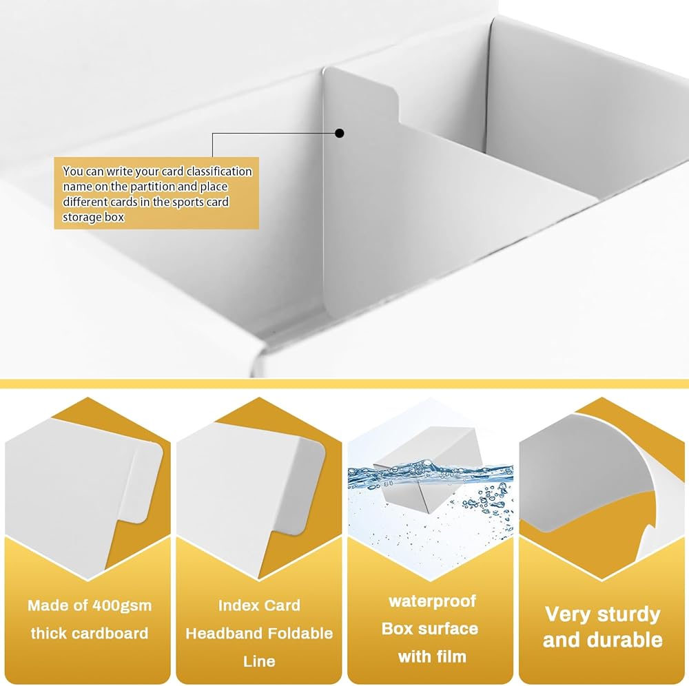 هيكل جميل وقوي: حقيبة تخزين بطاقات البيسبول مصنوعة من الورق المقوى الأبيض المموج على الوجهين، السطح الخارجي له طلاء مقاوم للماء، وهو خفيف الوزن ولكنه قوي جدًا ومتين. أكثر جمالا من الصناديق المموجة البيضاء أحادية الجانب، ولا يوجد تصميم غير ضروري، وسهل الاستخدام. فواصلنا المبوبة مصنوعة من الورق المقوى بسمك 400 جرامًا للمتر المربع ويمكن كتابتها وطباعتها لمساعدتك في فرز البطاقات والعثور عليها بكفاءة أكبر