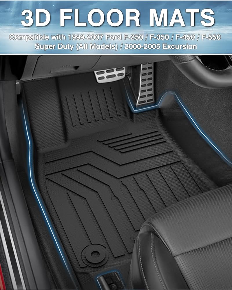 ملحقات سجادات الأرضية الملائمة حسب الطلب: بطانات الأرضية متوافقة مع 1999-2007 Ford F-250/F-350/F-450/F-550 Super Duty (جميع الموديلات). 2000-2005 رحلة فورد. يناسب أحجام الكابينة. *لا يعمل مع أرضيات الفينيل أو ناقل الحركة المثبت على الأرض 4×4.