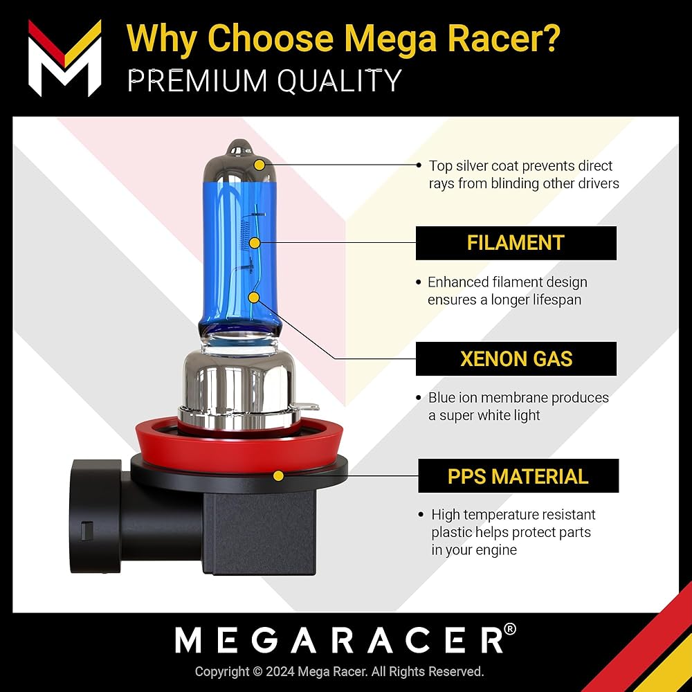 🥽 غاز زينون - يساعد الزينون على إبطاء عملية أكسدة التنغستن داخل مصابيحنا الأمامية H11 9005. يؤدي هذا إلى إطالة عمر المصابيح الأمامية لسيارتك حتى 2000 ساعة خدمة.
