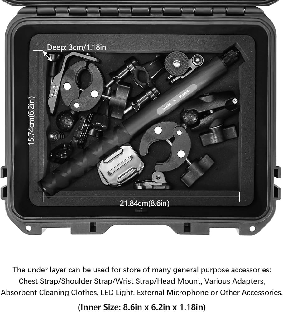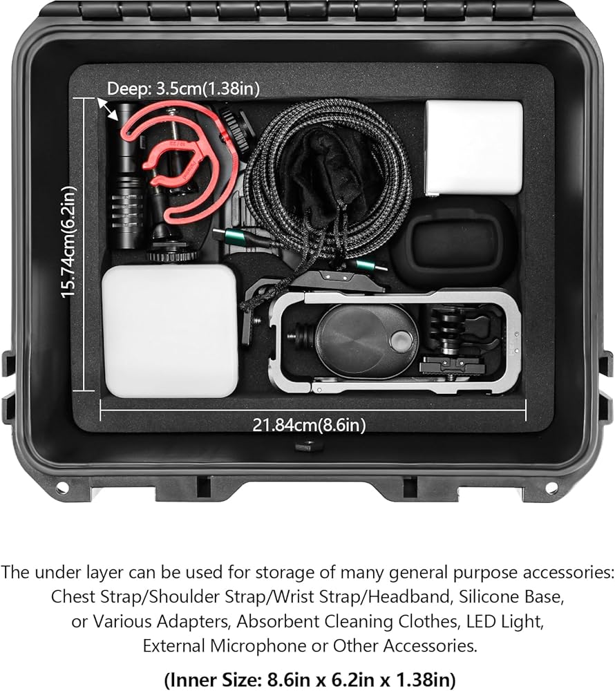 【طبقة سفلية عالمية】توفر الطبقة السفلية للعلبة X4 مساحة غير مقسمة (عمق 3.5 سم/1.38 بوصة)، مما يسمح للمستخدمين بتخزين الملحقات وفقًا لاحتياجاتهم. يُستخدم بشكل شائع لتخزين الميكروفون الخارجي، وإضاءة LED الصغيرة، وحامل حزام الصدر/الرأس/المعصم، وقاعدة حامل السيليكون، والتركيب الأفقي، وما إلى ذلك. متوافق مع عصا السيلفي غير المرئية Insta360 2 في 1 عن طريق إمالة أو قطع جزء من إيفا السفلي.