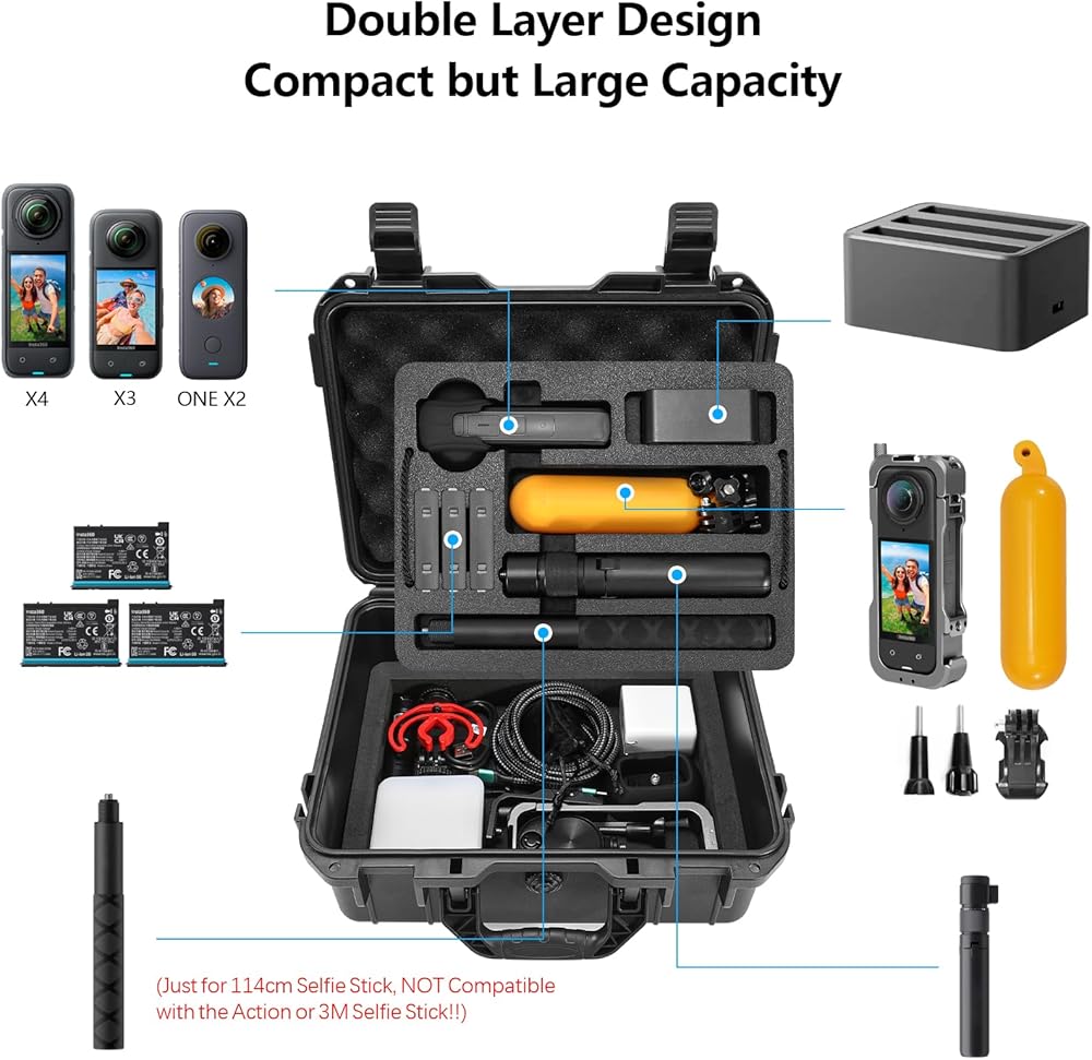 【حماية أفضل】تم تصنيع الغلاف الصلب من مادة ABS عالية الجودة، مما يوفر متانة قوية ومقاومة للصدمات لحماية جهاز Insta 360 X4 وملحقاته بشكل مثالي. مقاوم للغبار ومقاوم للماء مع تصميم قفل سريع، كما أنه يتميز بفتحتين لحزام الكتف (العرض: 1 بوصة، العمق: 1.5 بوصة) للعملاء الذين يحتاجون إلى حزام كتف.