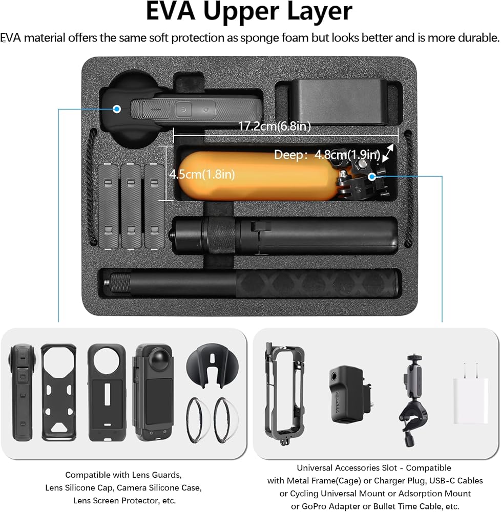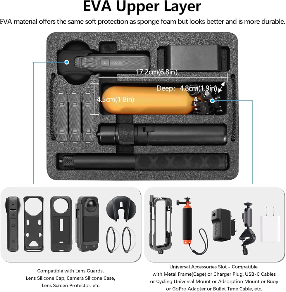 【تصميم محمول】هيكل صلب مزدوج الطبقات مصمم مدمج وهو حافظة حماية مفيدة لجهاز Insta360 X4 بأبعاد خارجية مقاس 11.4*9.4*4.9 بوصة (29*24*12.5 سم). حقيبة حمل رائعة للتخزين أو الاستخدام أثناء السفر لكاميرا InstaX4. ما عليك سوى استخدام سكين لقطع فتحة مباشرة في سطح EVA لتخزين بطاقة SD.